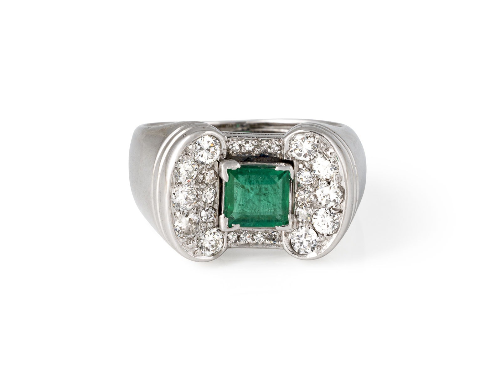 WG 585. Ringmaß: ca. 51. Ringkopfmaße: ca. 16,1 mm x 11,5. Ges.-Gew.: ca. 5,0 g. Art Déco Ring, besetzt mit einem zentralen Smaragd von ca. 0.40 ct., sowie Diamanten in