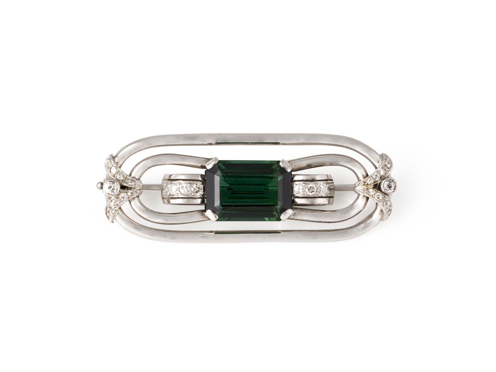 WG 585. Maße: ca. 47,5 mm x 18,1 mm. Ges.-Gew.: ca. 7,4 g. Ovale Brosche mit einem zentralen, rechteckig facettierten Turmalin von ca. 6.10 ct.,