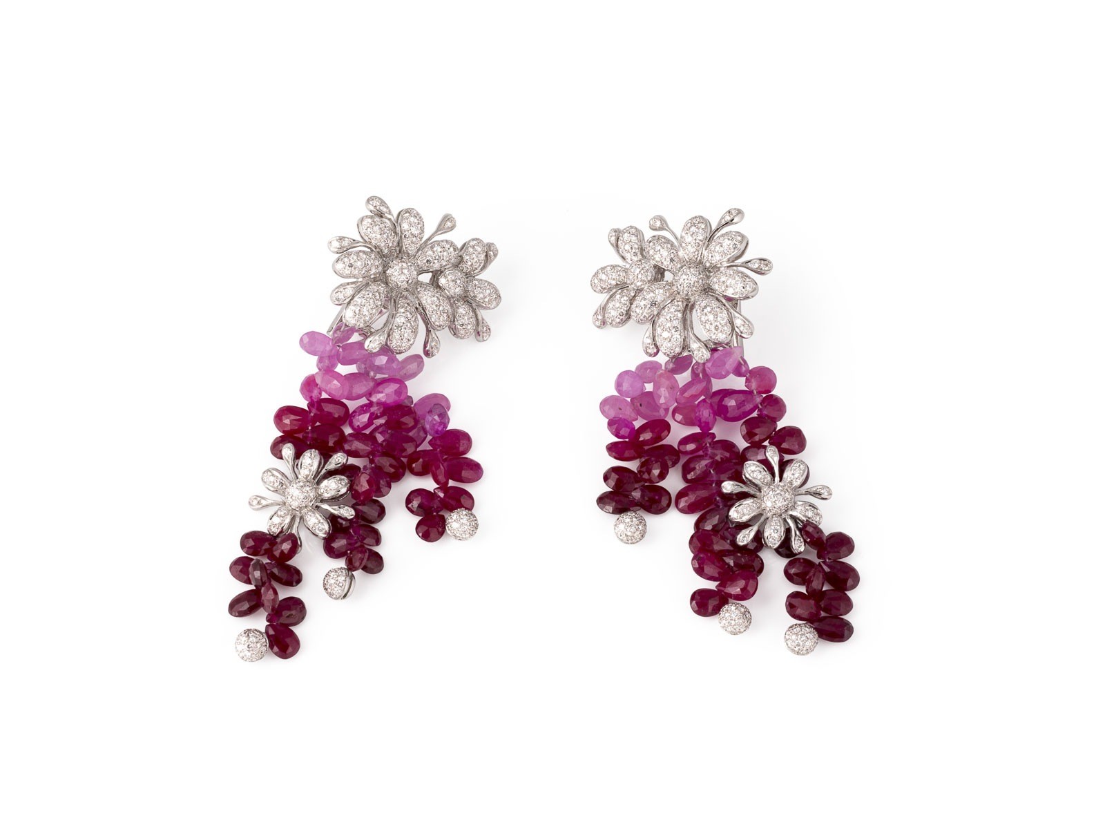 WG 750. Maße: L.: ca. 82,0 mm. Ges.-Gew.: ca. 33,6 g. Faszinierende Ohr Clipstecker mit floralen Motiven, sowie bewegliche Stränge mit Rubinen