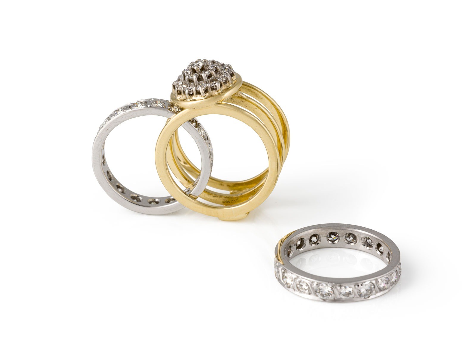 WG 750, GG 585. Ringmaß: ca. 53. Ringbreite: ca. 12,4 mm. Ges.-Gew.: ca. 16,7 g. Außergewöhnlicher, 3-Teiliger Eternity Ring, bestehend aus 2 Eternity Ringen in WG und ein