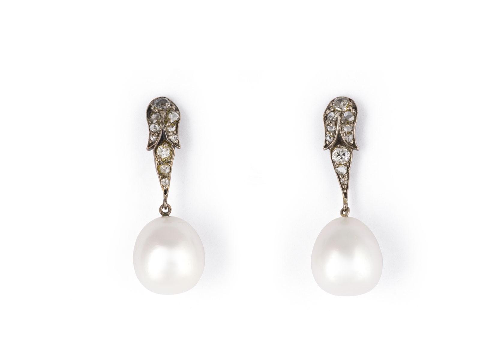 AG/GG 585 (getestet). L.: ca. 34,5 mm. Ges.-Gew.: ca. 8,2 g. Ohrhänger, besetzt mit je einer großen, tropfenförmigen Perle ca. 12,5 x 13,6 mm, sowie