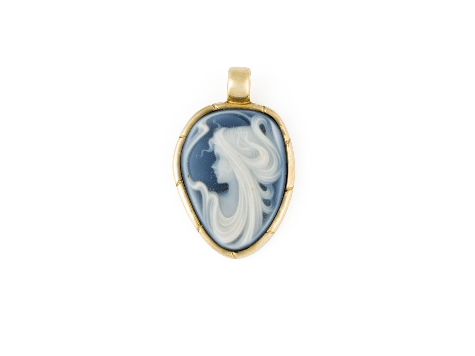 GG 585. Maße: ca. 35,2 mm x 22,4 mm. Ges.-Gew.: ca. 7,4 g. Blauer Kamee Anhänger.