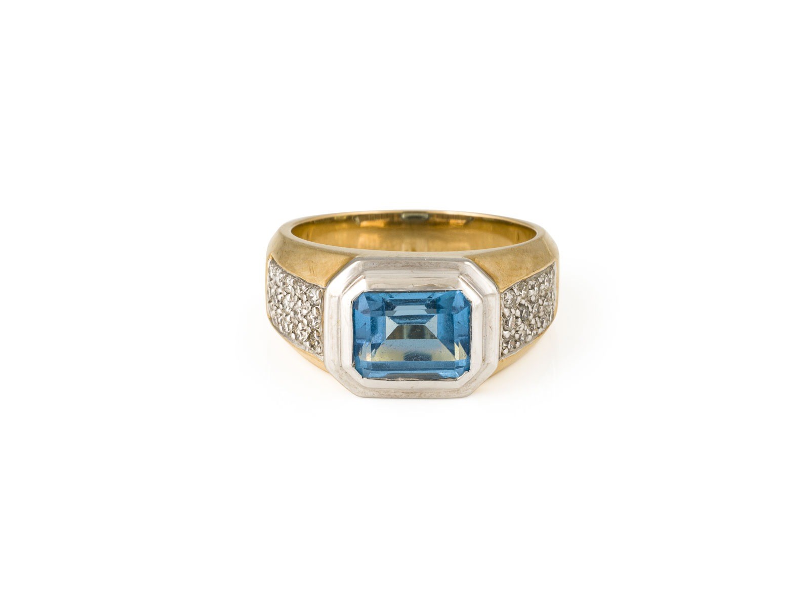 GG 585. Ringmaß: ca. 58. Ringbreite: ca. 10,8 mm. Ges.-Gew.: ca. 10,2 g. Ring, besetzt mit einem Blautopas von ca. 2.54 ct., sowie Brillantenbesatz an den seiten