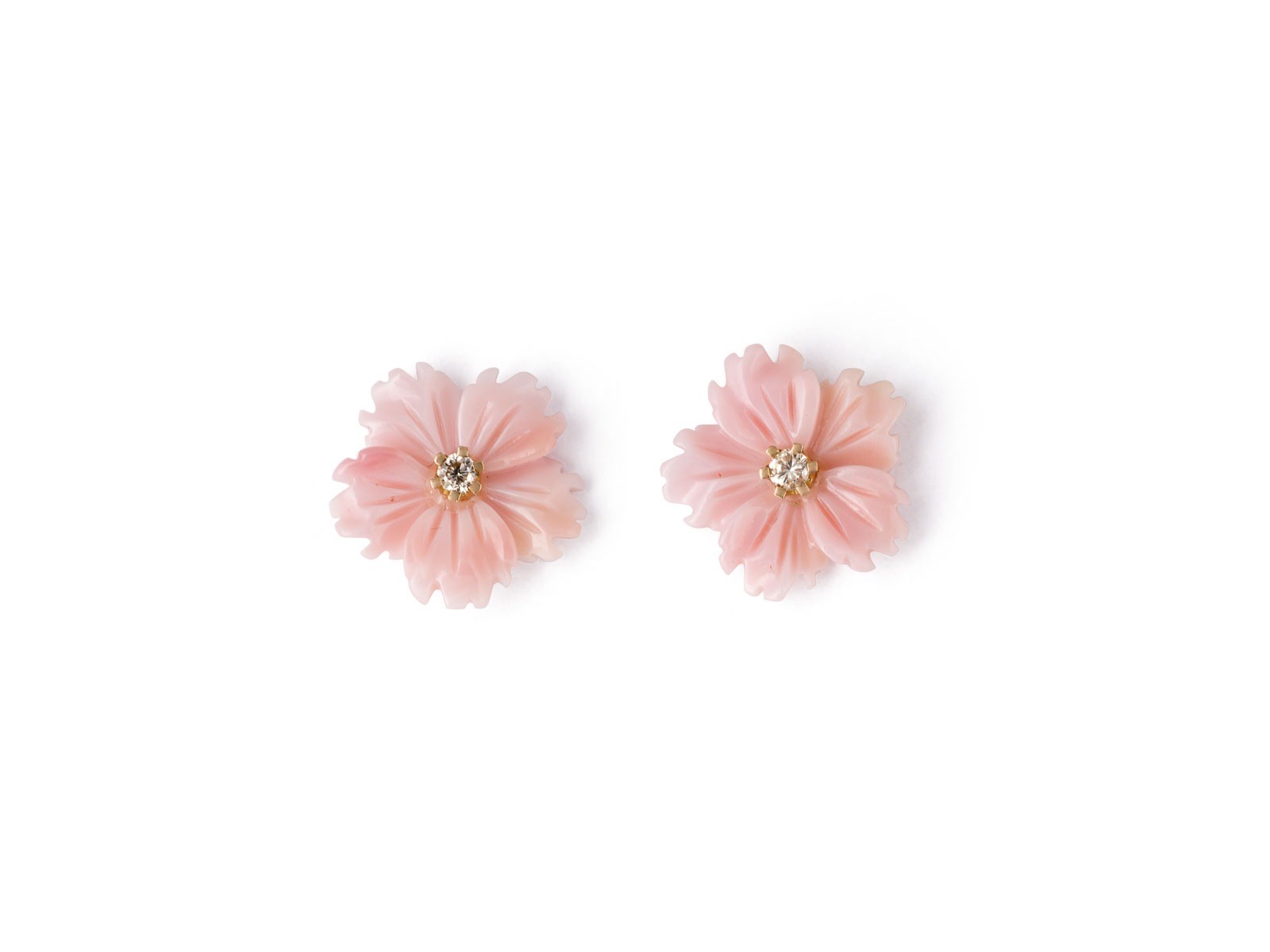 GG 750. Maße: D.: ca. 14,0 mm. Ges.-Gew.: ca. 2,0 g. Fein geschnitzte Blüten-Ohrstecker aus pinkem Achat, besetzt mit jeweils einem zentralen