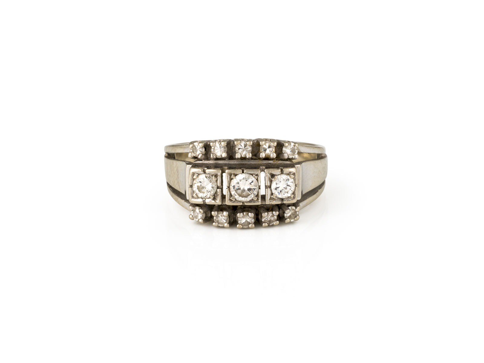 WG 585. Ringmaß: ca. 52,5. Ringkopfmaße: ca. 10,7 mm x 13,. Ges.-Gew.: ca. 5,7 g. Ring, besetzt mit Diamanten zus. ca. 0.30 ct. H-J/VS-SI.