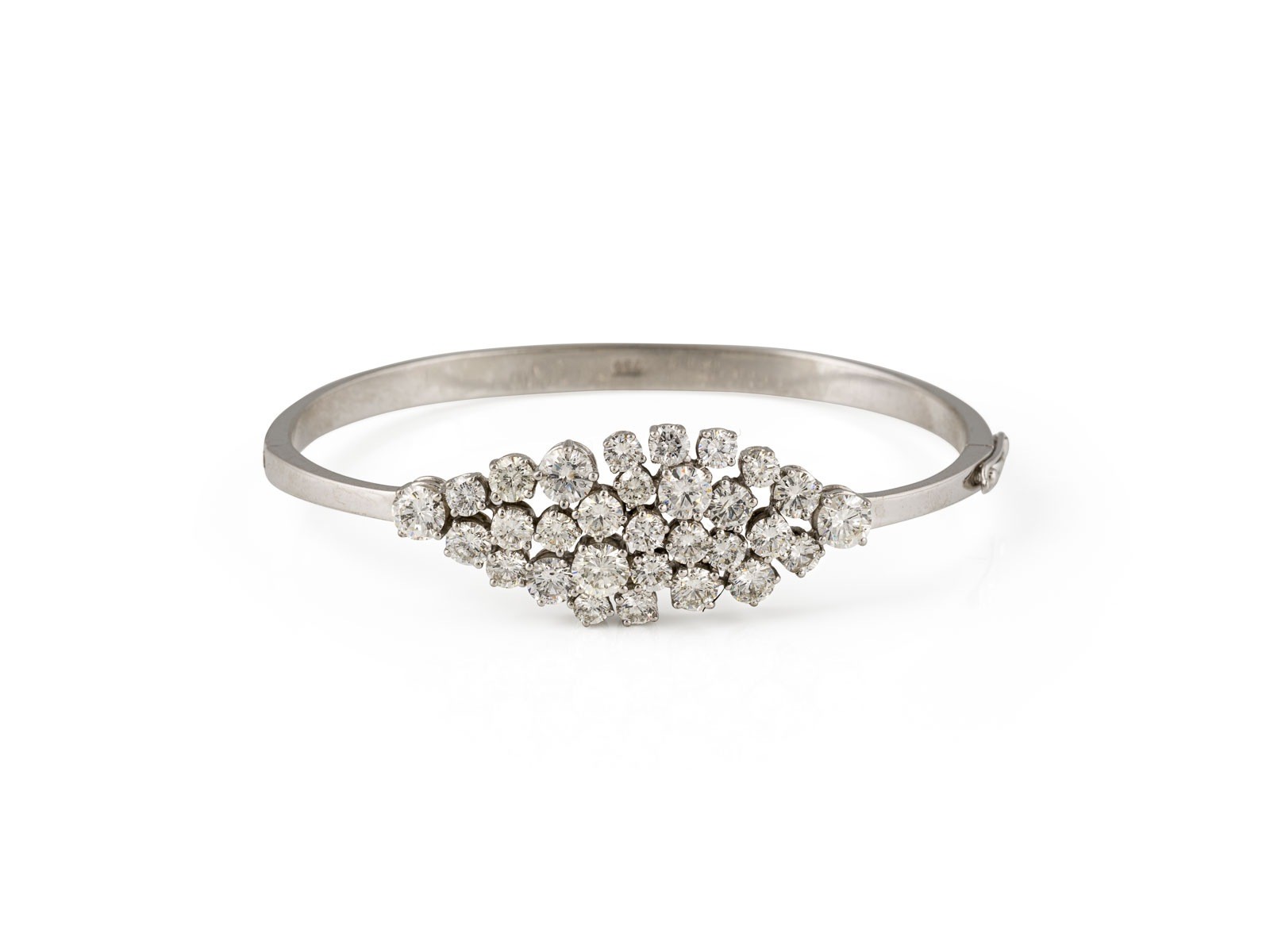 WG 750. Maße: D.(innen): ca. 57,0 mm. Kopfmaße: ca. 16,1 m. Ges.-Gew.: ca. 17,9 g. Armreif, üppig besetzt mit Brillanten zus. ca. 4.50 ct. G-H/VVS-P.