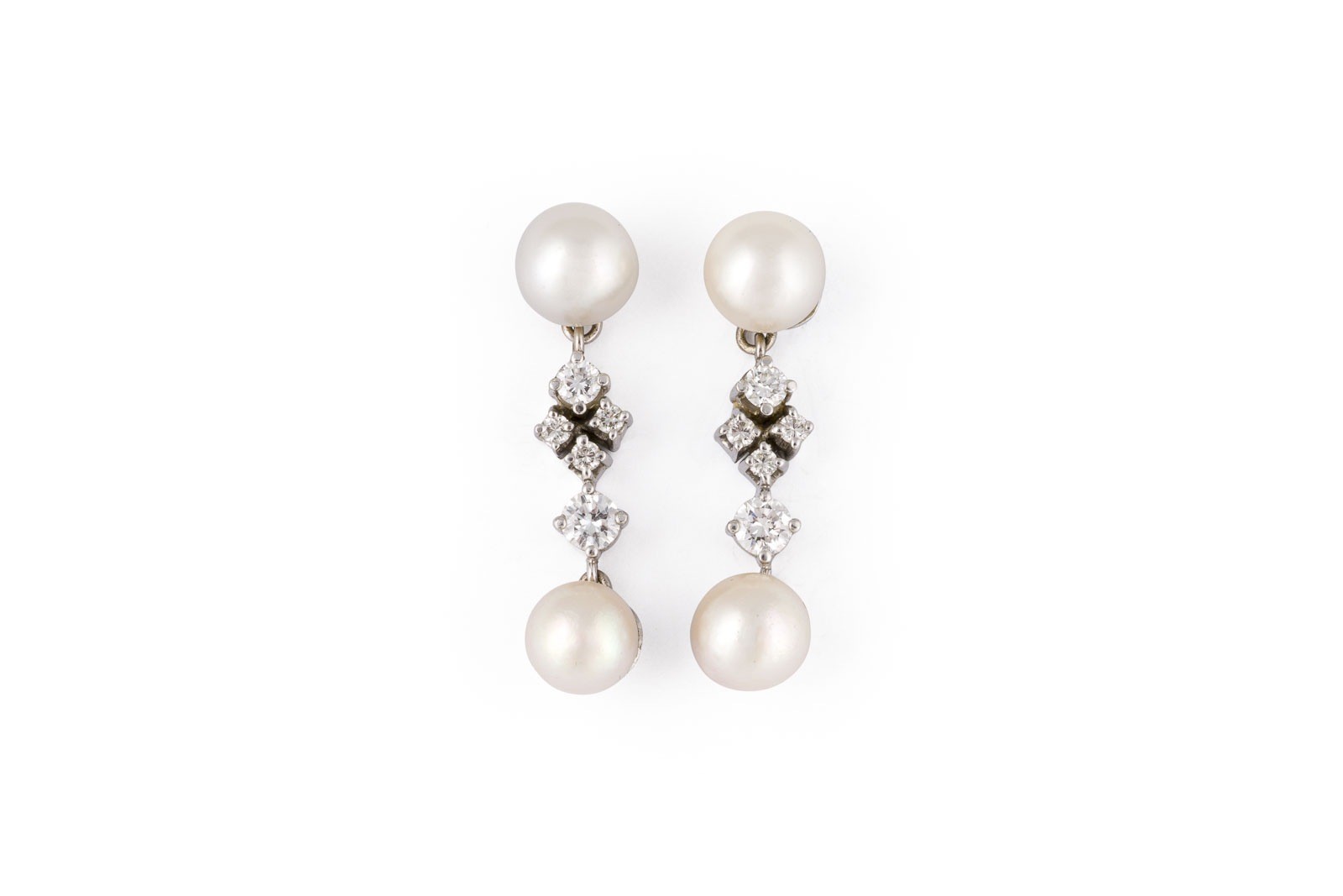 WG 585. L.: ca. 35,0 mm. Ges.-Gew.: ca. 6,8 g. Ohrstecker, besetzt mit Perlen D.(Perle): ca. 7,5-8,2 mm, sowie Brillanten zus. ca. 1.20