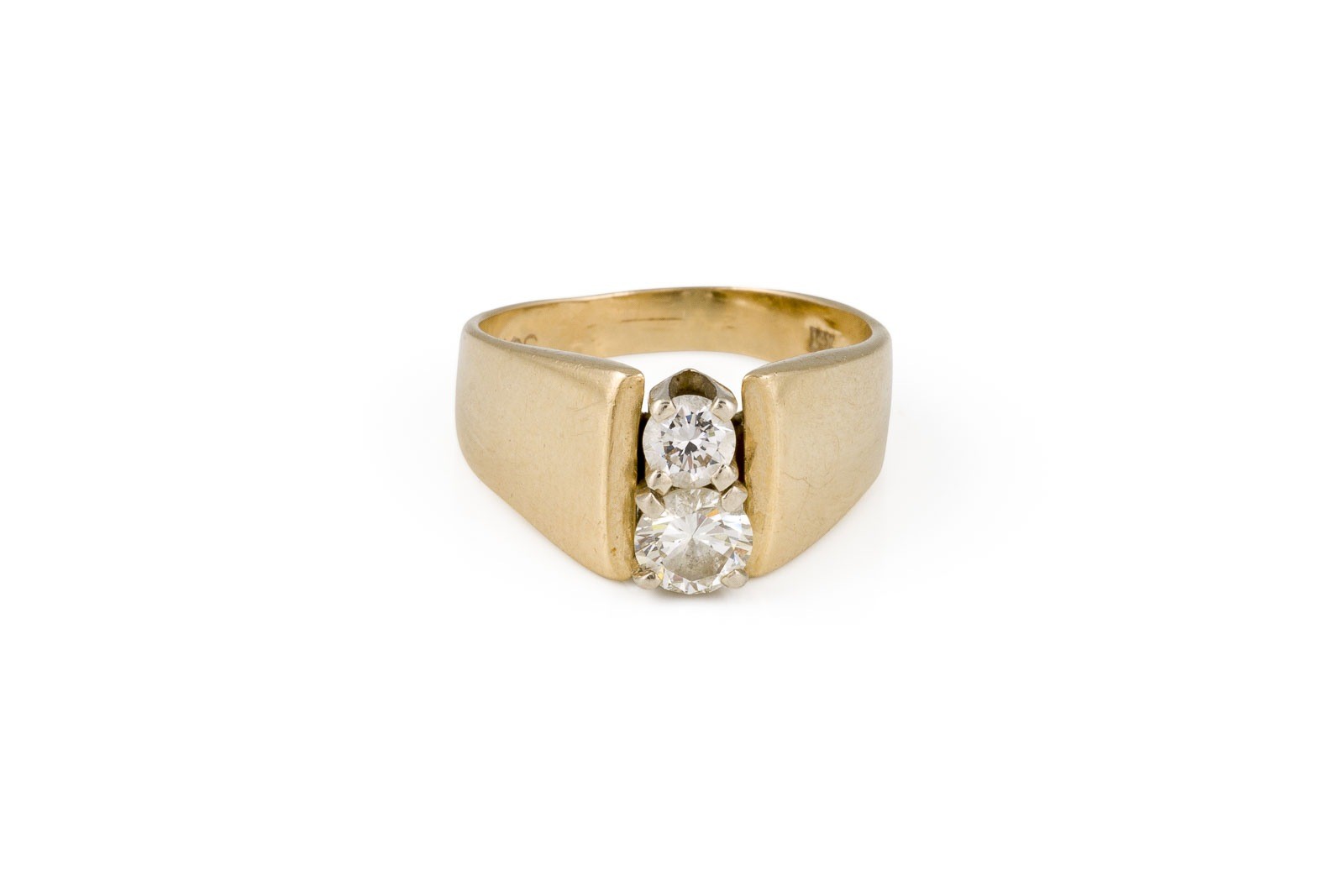 GG 585. Ringmaß: ca. 54. Ringbreite: ca. 9,6 mm. Ges.-Gew.: ca. 6,8 g. Ring, besetzt mit zwei Brillanten zus. ca. 0.70 ct. H-I/VVS-VS.