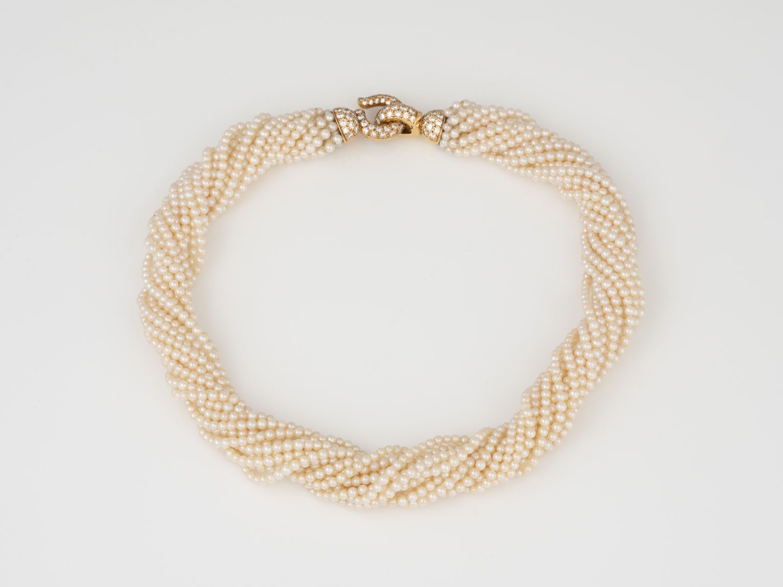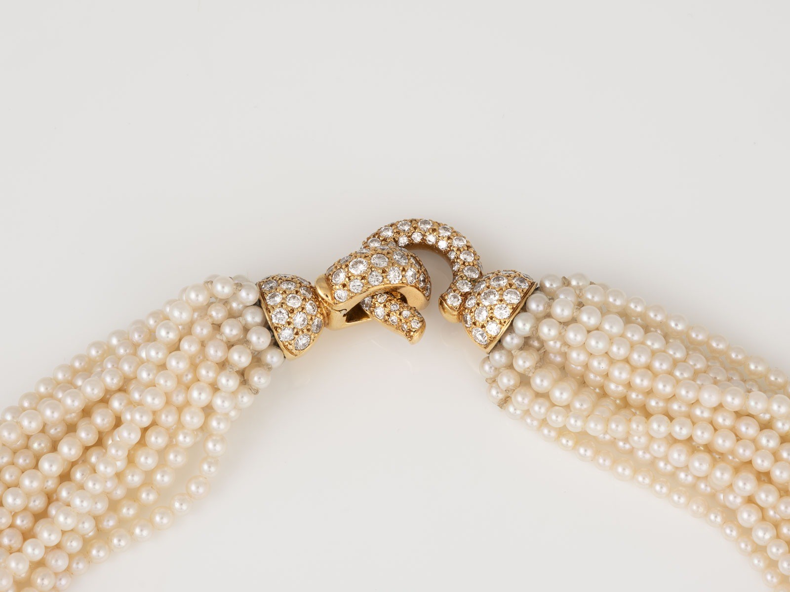Gelbgold. L. 43 cm, Ges.-Gew. ca. 85,5 g. Gest. 750, Herstellersignet, französische Marke 'Adlerkopf', nummeriert. 16-reihiges Perl-Collier, D. der Perlen jeweils ca. 2,8 mm, Schließe besetzt mit 99