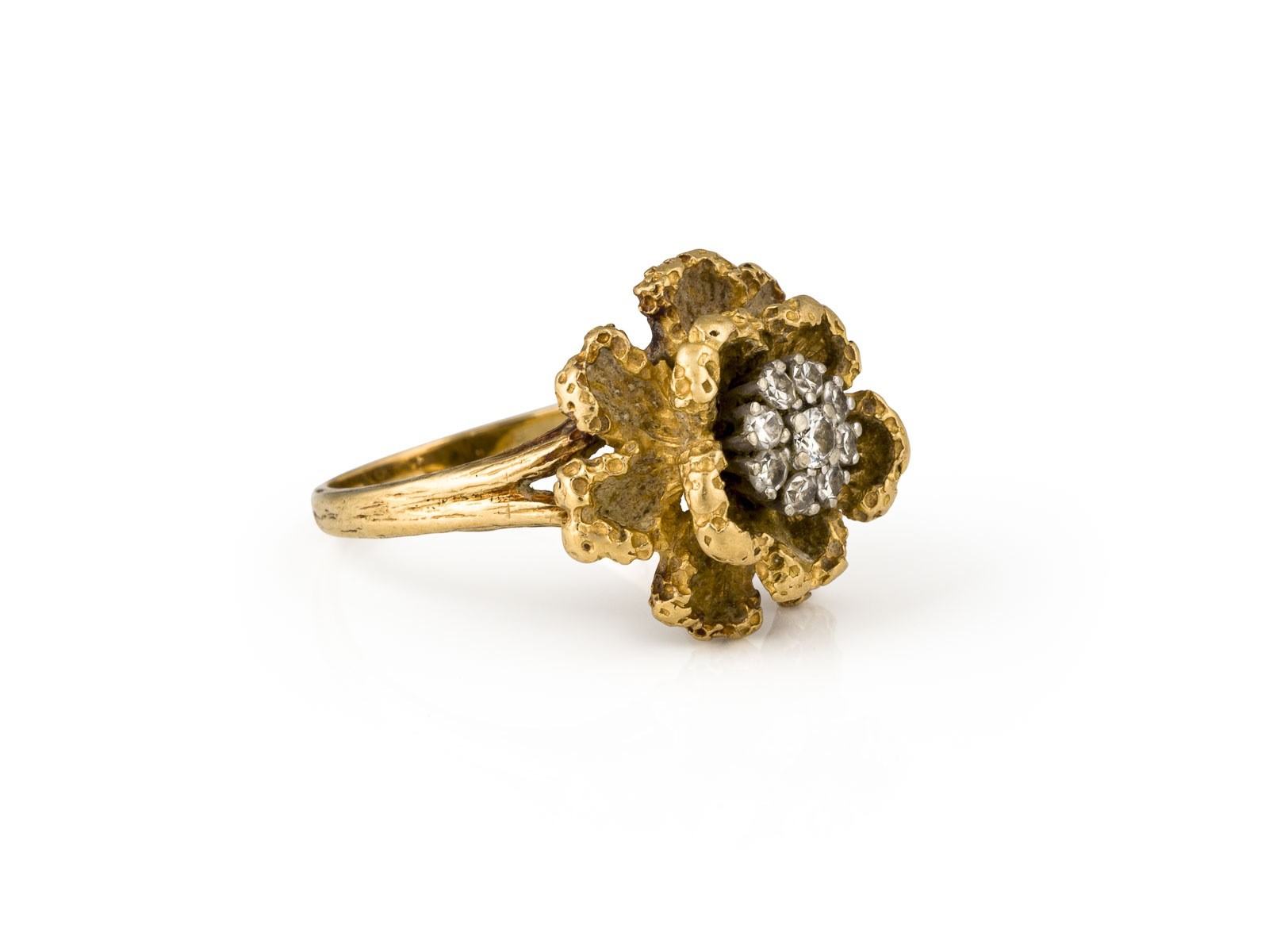 GG 750. Ringmaß: ca. 58. Ringkopfmaße: D.: ca. 17,7 mm, H.. Ges.-Gew.: ca. 9,9 g. Ring im Blütenmotiv, besetzt mit Diamanten zus. ca. 0.20 ct.
