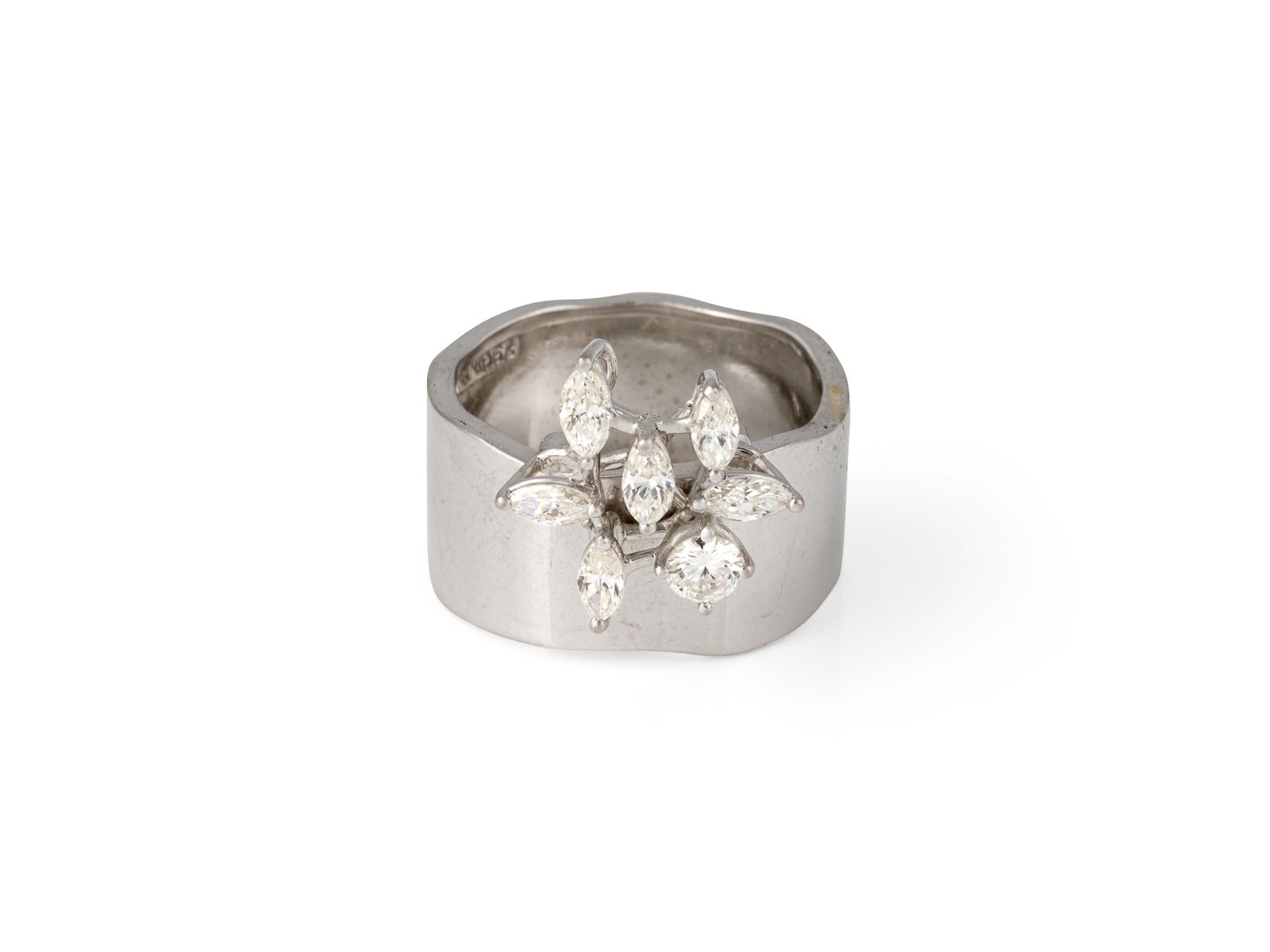 WG 750. Ringmaß: ca. 53. Ringbreite: ca. 10,4 mm. Ges.-Gew.: ca. 7,1 g. Ring, besetzt mit 6 Diamanten im Navetteschliff und einem Brillanten zus. ca. 0.75 ct.