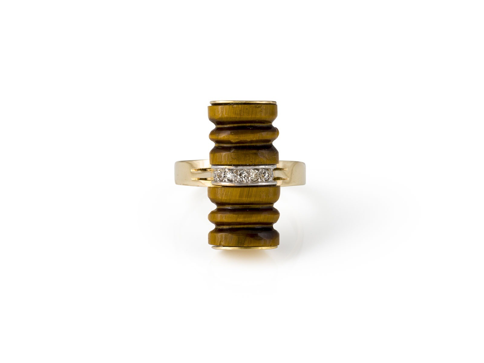 GG 585. Ringmaß: ca. 52. Ringkopfmaße: ca. 21,2 mm x 10,3. Ges.-Gew.: ca. 6,5 g. Design Ring mit einem Katzenaugen-Quarz, sowie Brillantbesatz zus. ca. 0.09 ct.