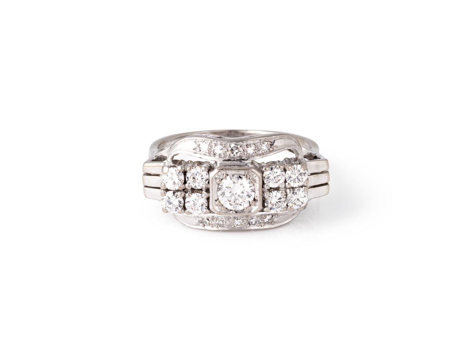 WG 585. Ringmaß: ca. 58, Ringkopfmaße: ca. 22,1 mm x 11,4. Ges.-Gew.: ca. 3,8 g. Ring mit Diamantbesatz zus. ca. 0.90 ct. Hauptstein Brillant von ca. 0.40 ct TW/SI.