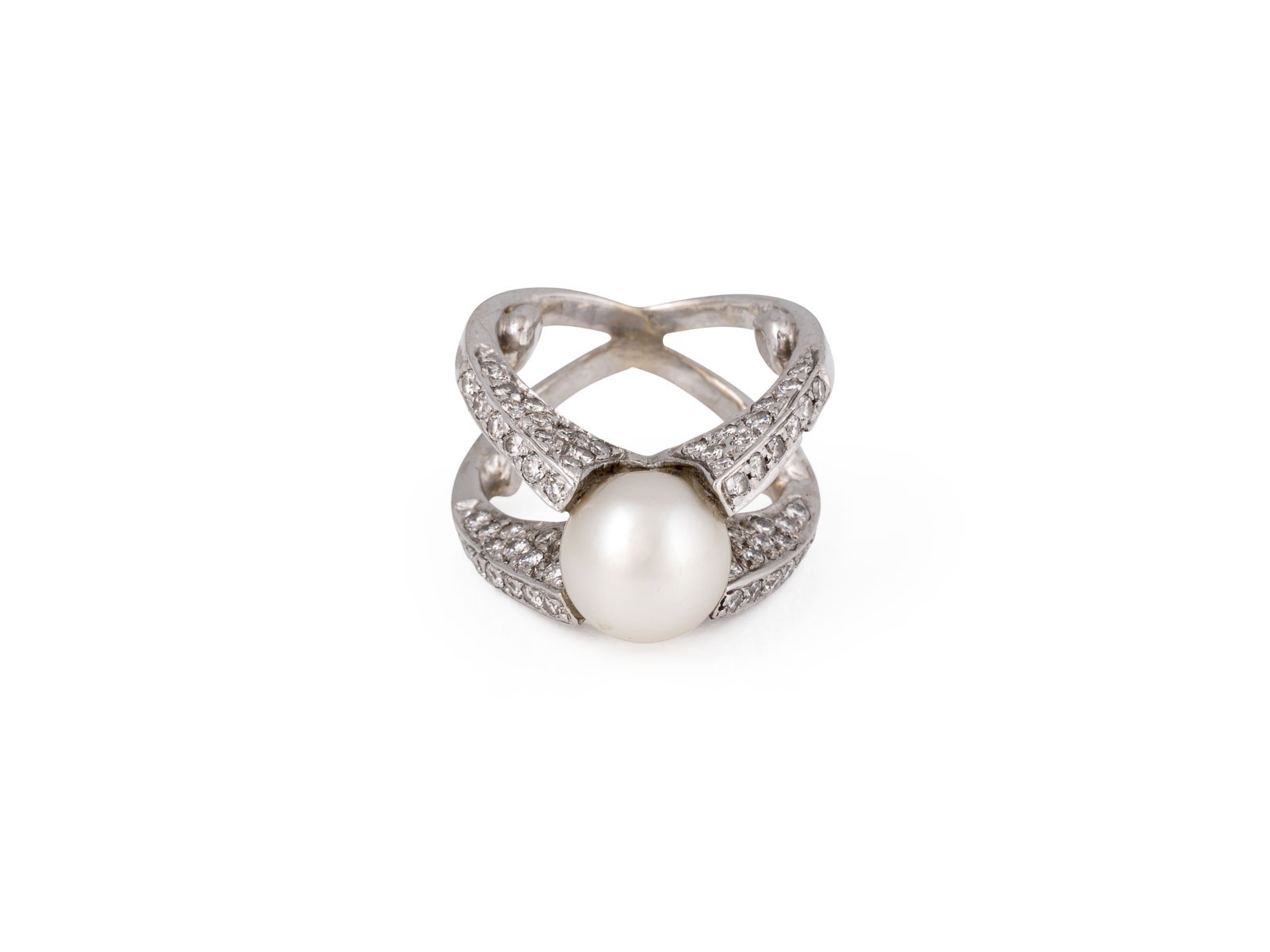 WG 750 (getestet). Ringmaß: ca. 47.. Ges.-Gew.: ca. 10,9 g. Mehrsträngiger Ring, besetzt mit einer zentralen Perle. D.(Perle): ca. 9,5 mm, sowie