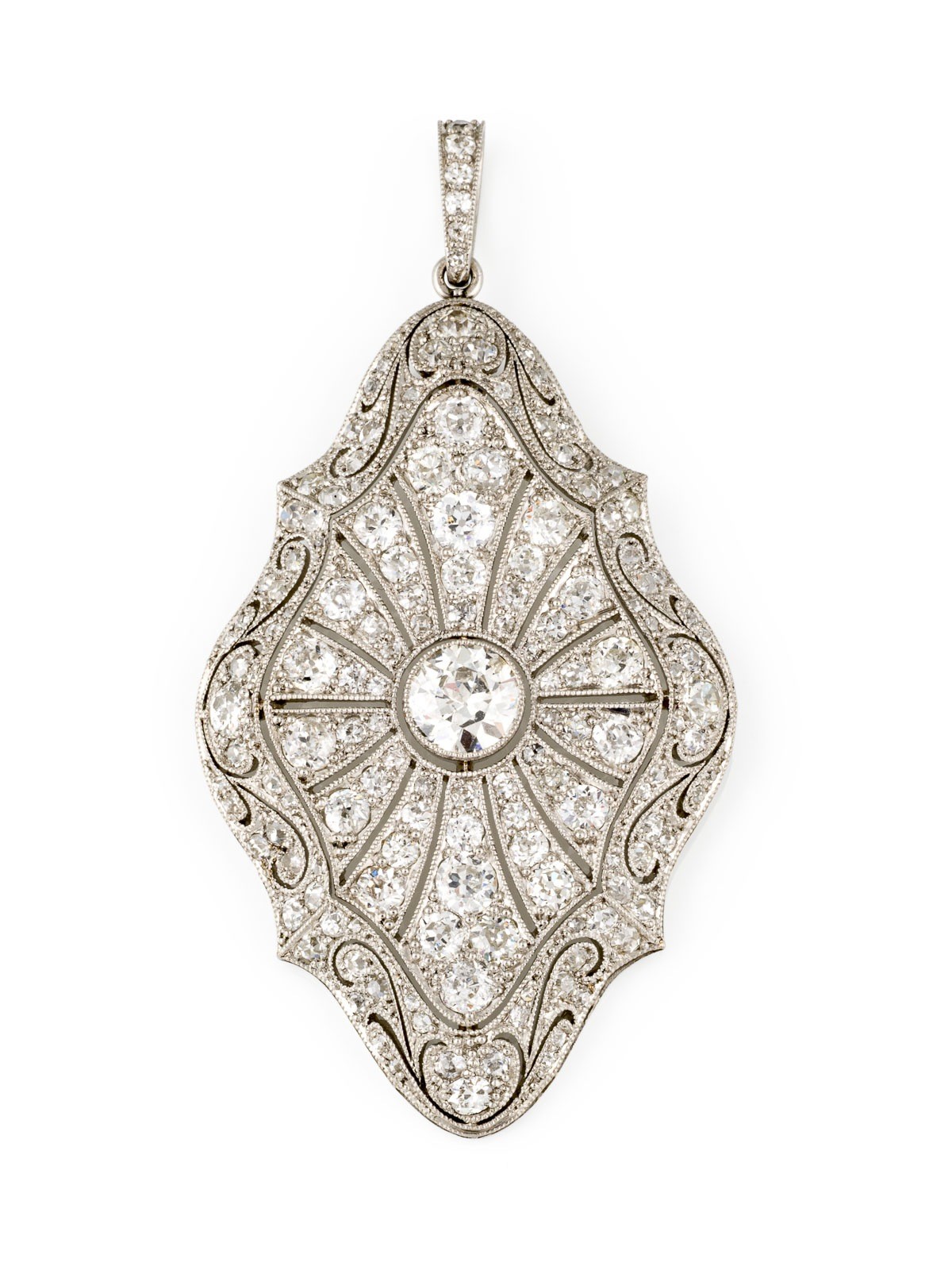 PT 850 (getestet). Maße: ca. 57,3 x 29,7 mm. Ges.-Gew.: ca. 11,9 g. Anhänger, üppig besetzt mit Diamanten im Altschliff und 8/8-Schliff zus. ca. 4.00 ct.