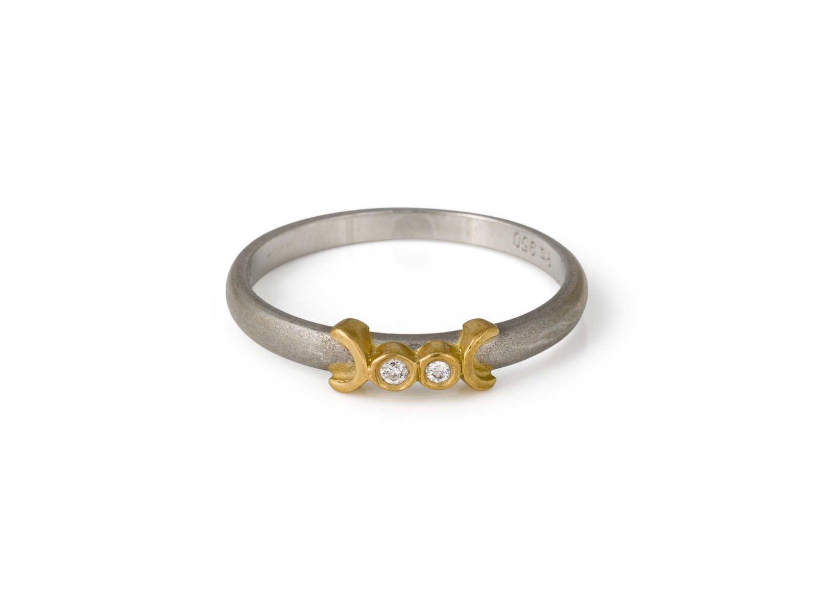 GG 750, PT 950. Ringmaß: ca. 52. Ringbreite: ca. 3,7 mm. Ges.-Gew.: ca. 2,7 g. Feiner Ring mit zwei Diamanten zus. ca. 0.02 ct.