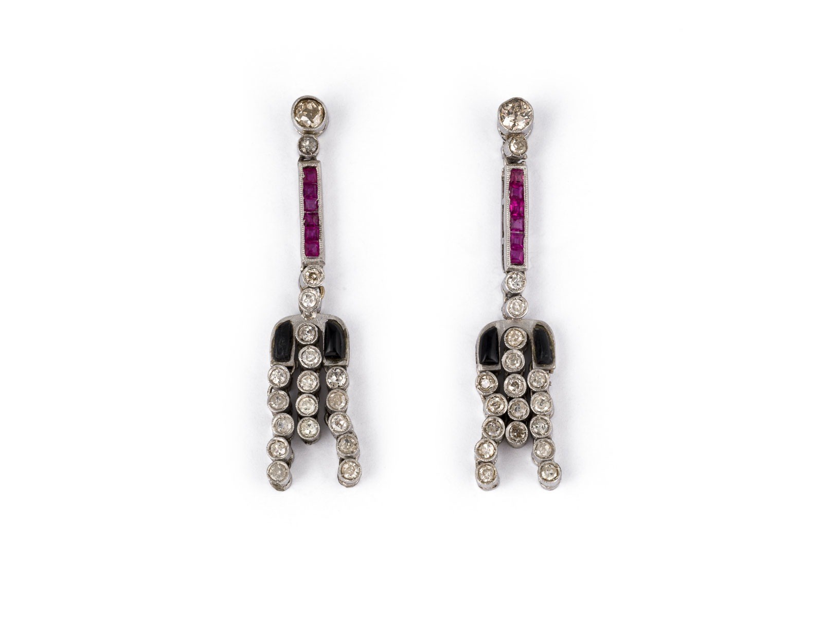 PT/WG. L.: ca. 37,0 mm. B.: ca. 7,5 mm. Ges.-Gew.: ca. 5,8 g. Ohrstecker, besetzt mit Onyx, pinken Farbsteinen, sowie Diamanten im Alt- und 8/8-Schliff