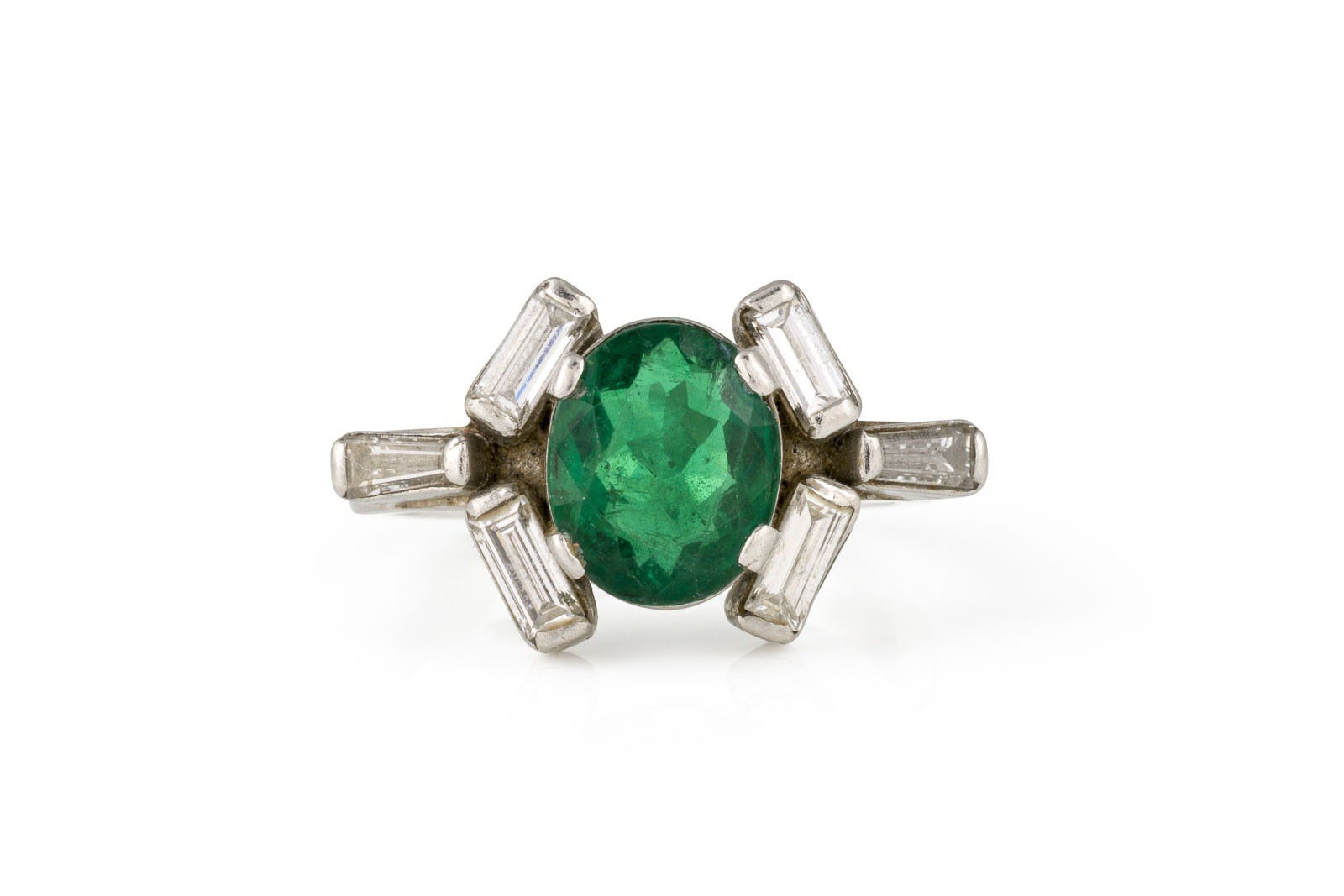 PT. Ringmaß: ca. 58. Ringkopfmaße: ca. 25,0 x 14,2 mm. Ges.-Gew.: ca. 10,5 g. Ring, besetzt mit einem zentralen Smaragd von ca. 2.20 ct., flankiert von Diamanten im