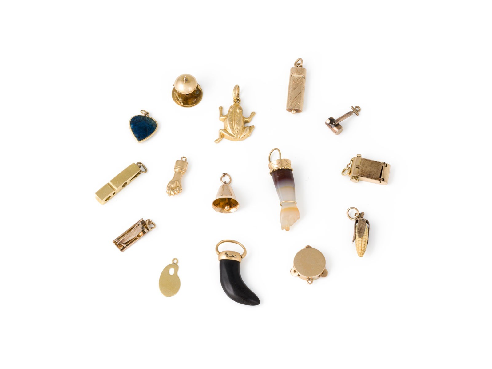 GG 585,750. Großes Konvolut an Charm-Anhängern. 1x Frosch GG 750 ca. 2,6 g. 1x Horn aus wohl Gagat und