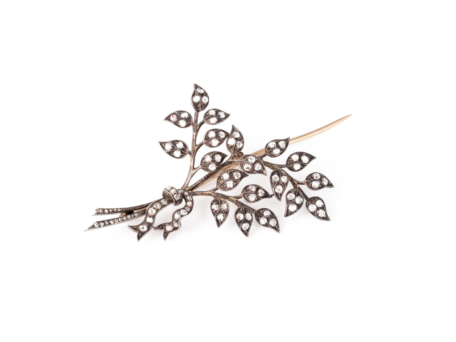 AG/RG 585 (getestet). Maße: L.: ca. 80,5 mm. B.: ca. 60,6 mm. Ges.-Gew.: ca. 22,2 g. Große Brosche im Form eines gebundenen Blätterzweigs, üppig besetzt mit ca. 89
