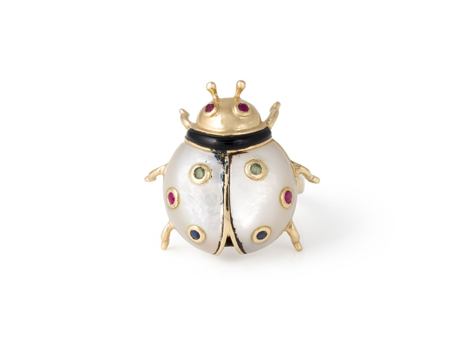 GG 585. Ringmaß: ca. 54,5. Ringkopfmaße: ca. 24,6 mm x 25,. Ges.-Gew.: ca. 7,9 g. Ring in Form eines Perlmutt-Käfers mit 2 kleinen Rubinen als Augen, sowie jeweils 2