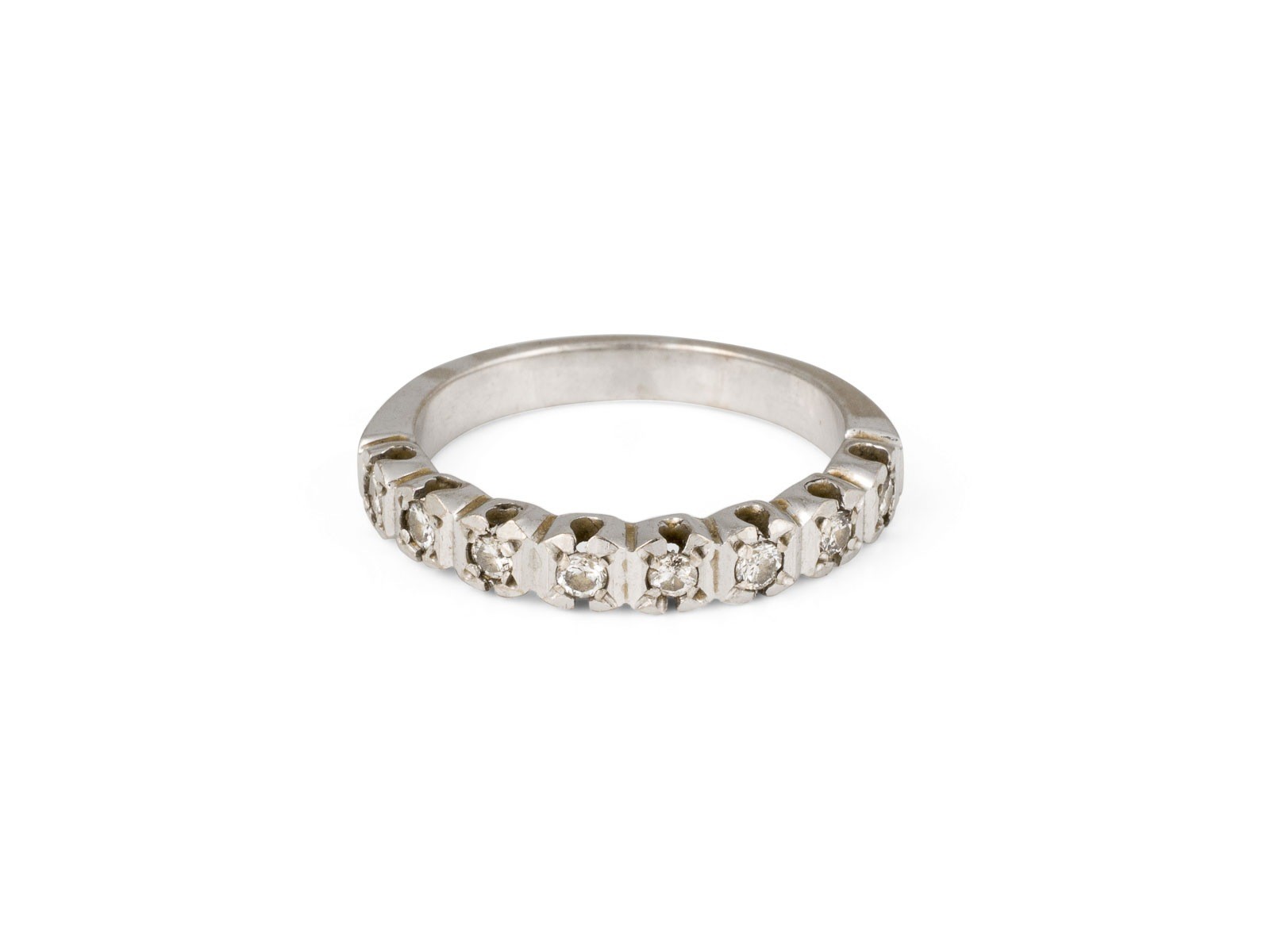 WG 750 (getestet). Ringmaß: ca. 53. Ringbreite: ca. 3,5 mm. Ges.-Gew.: ca. 4,0 g. Halb Memoirering mit 8 Diamanten zus ca. 0.16 ct.