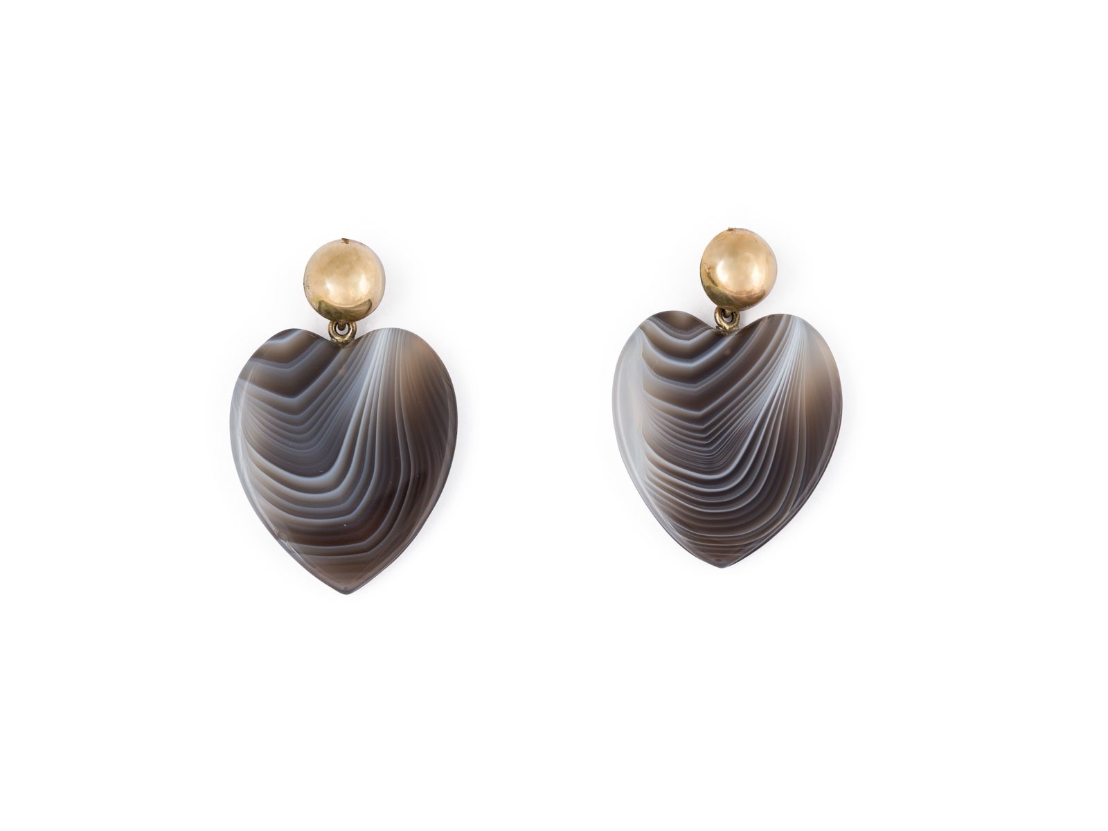 GG 333 (getestet). Maße: ca. 37,0 x 21,7 mm. Ges.-Gew.: ca. 7,5 g. Ohrhänger, besezt mit je einem Herzen aus Achat. Min best.