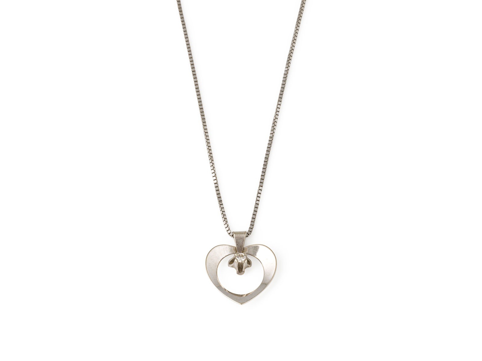 WG 750. Maße: L.(Collier): ca. 38,0 cm. Ges.-Gew.: ca. 3,2 g. Herzanhänger mit einem Brillanten von ca. 0.05 ct. an Collier. Maße(Anhänger): ca. 17,1 mm