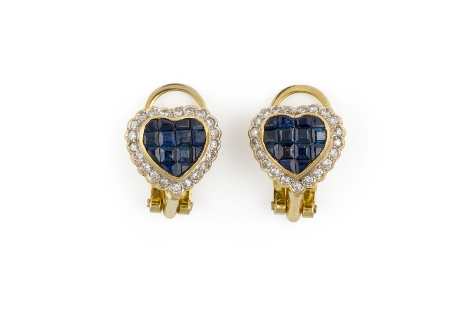 GG 585 (getestet). Maße: ca. 12,3 x 12,0 mm. Ges.-Gew.: ca. 6,8 g. Herzförmige Ohrclips mit einsteckbaren Steg, besetzt mit Saphiren von ca. 0.50 ct. und