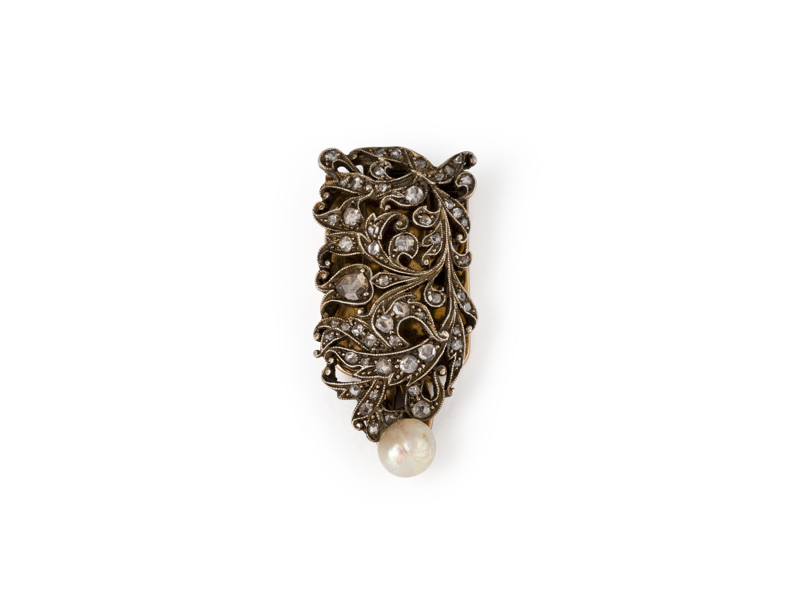 AG/RG 750 (getestet). Maße: L.: ca. 35,0 mm, B.: ca. 17,0 mm. Ges.-Gew.: ca. 10,2 g. Historischer Clip mit Diamantbesatz im Rosenschliff zus. ca. 0.50 ct. und einer Perle.