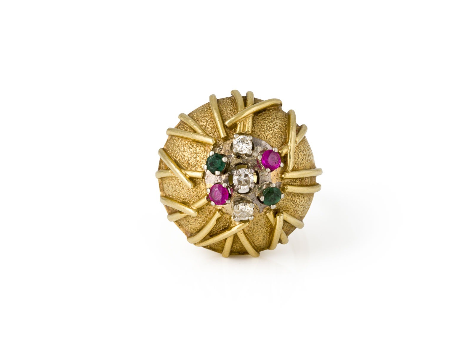 GG 750. Ringmaß: ca. 53. Ringkopfmaße: D.: ca. 21,0 mm. H.. Ges.-Gew.: ca. 11,5 g. Ring, besetzt mit 3 Diamanten zus. ca. 0.15 ct., sowie zwei Smaragde und zwei Rubine.