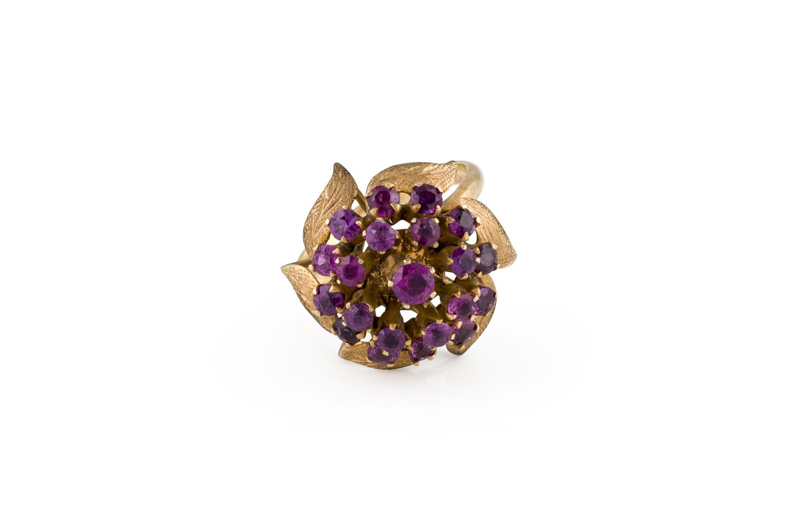 GG 585. Ringmaß: ca. 53. D.: ca. 18,0 mm. H.: ca. 16,0 mm. Ges.-Gew.: ca. 5,9 g. Hoher Ring in Blütenform, besetzt mit wohl pinken Saphiren zus. ca. 1.20 ct.