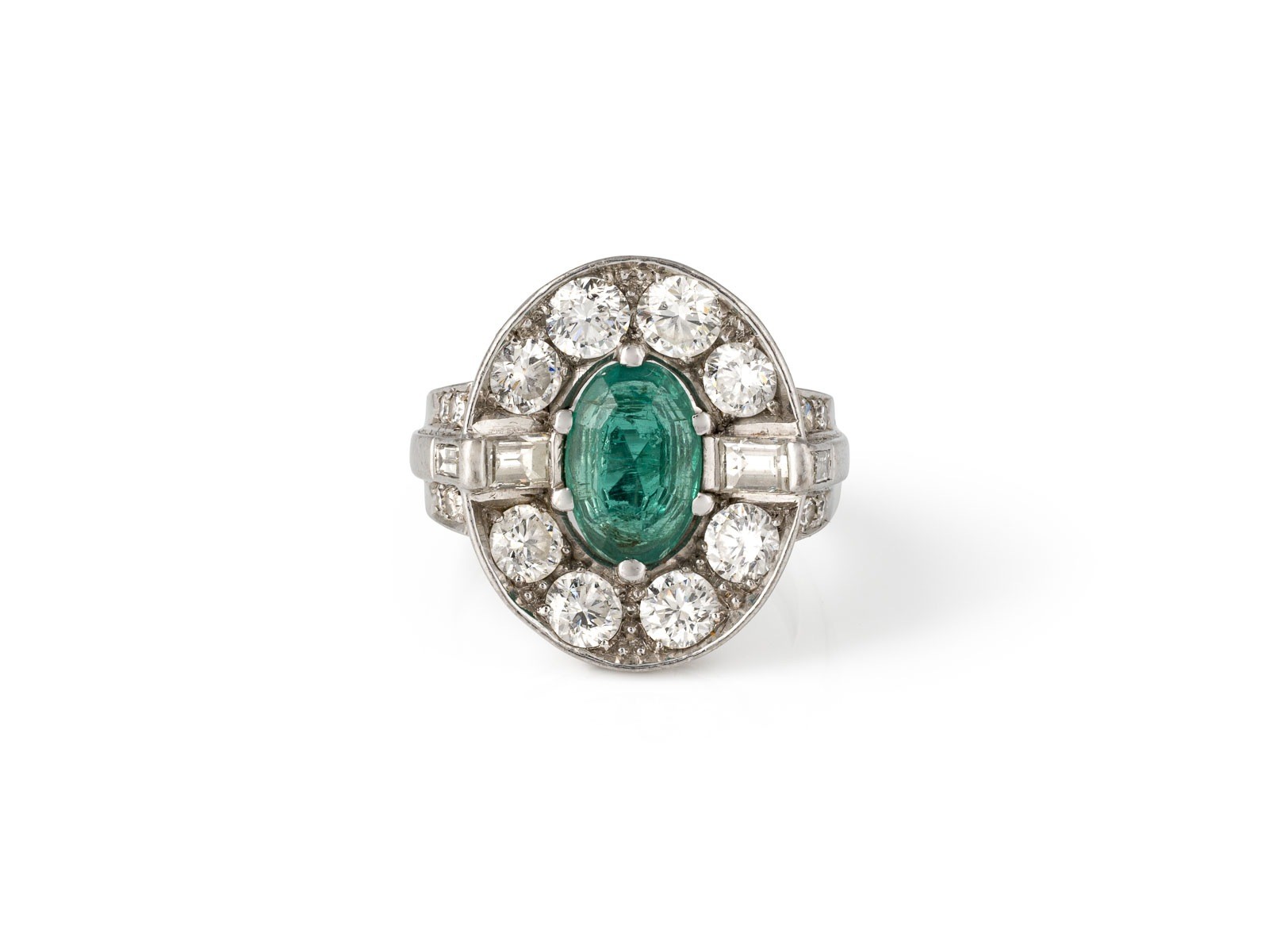 WG 750. Ringmaß: ca. 55,5. Ringkopfmaße: ca. 21,0 mm x 20,. Ges.-Gew.: ca. 11,7 g. Imposanter Ring, mit einem zentralen, oval facettierten Smaragd von ca. 1.50 ct. und einem