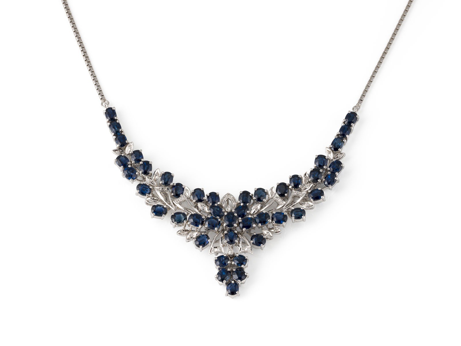 WG 585. Maße: L. ca. 45,0 cm. Anhänger: ca. 110 mm x 33,0. Ges.-Gew.: ca. 26,3 g. Imposantes Collier, üppig besetzt mit Saphiren zus. ca. 15.00 ct., sowie kleinen Diamanten