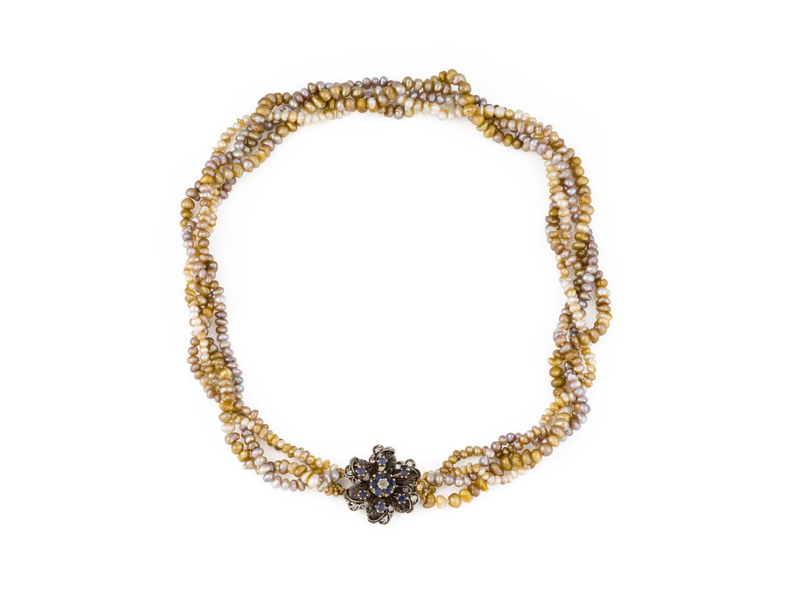 AG(getestet)/GG 750. L.(Collier): ca. 49,0 cm. Ges.-Gew.: ca. 67,8 g. 4-strängiges Perlencollier mit einem Verschluss im Jugendstil, besetzt mit Diamantrosen