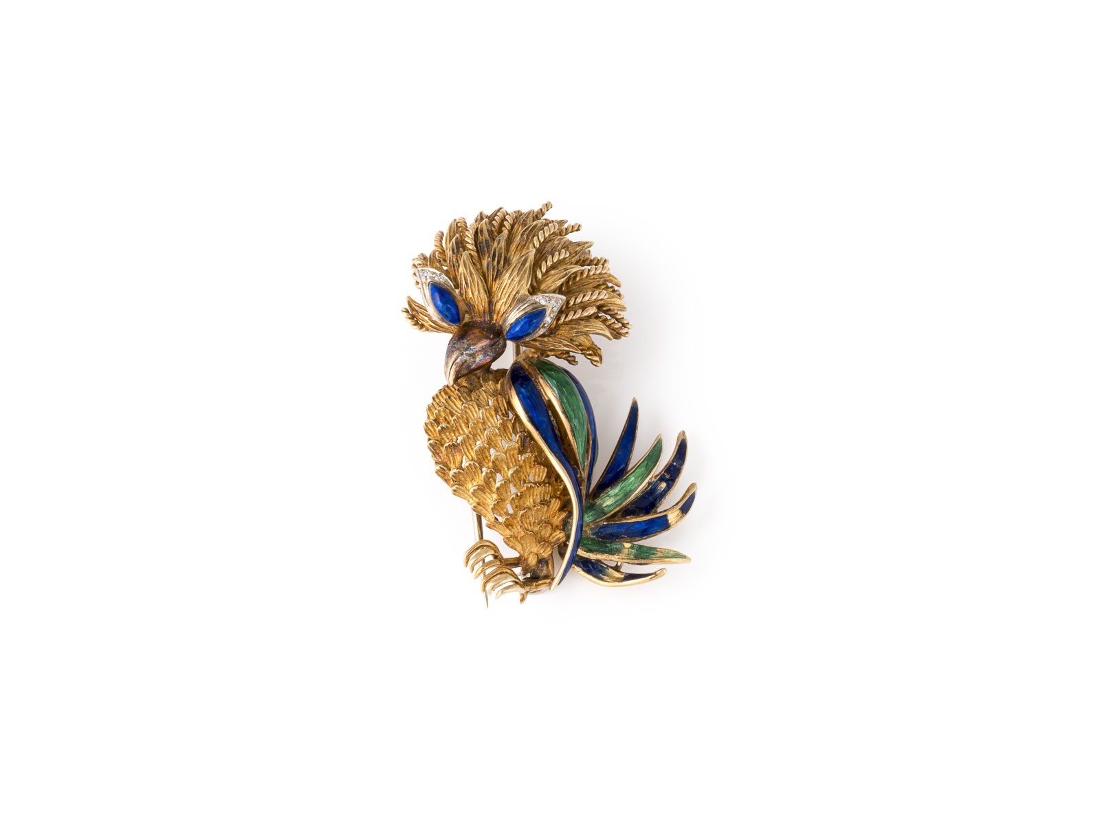 GG 750. Maße: L.: ca. 45,8 mm, B.: ca. 29,7 mm. Ges.-Gew.: ca. 21,1 g. Große, detailreiche Brosche in Form eines Kakadus, verziert mit Emaille und 5 Diamanten im