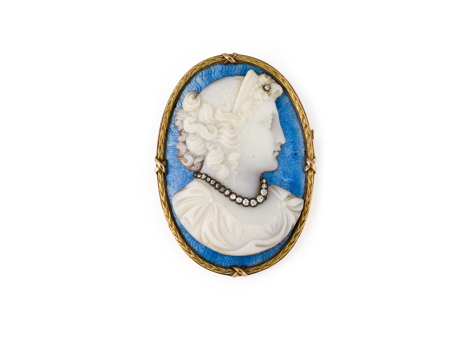 GG 585 (getestet). Maße: ca. 49,5 mm x 35,8 mm. Ges.-Gew.: ca. 26,6 mm. Muschelkamee-Brosche mit der Darstellung einer höfischen Dame und Diamanten zus. ca. 0.17