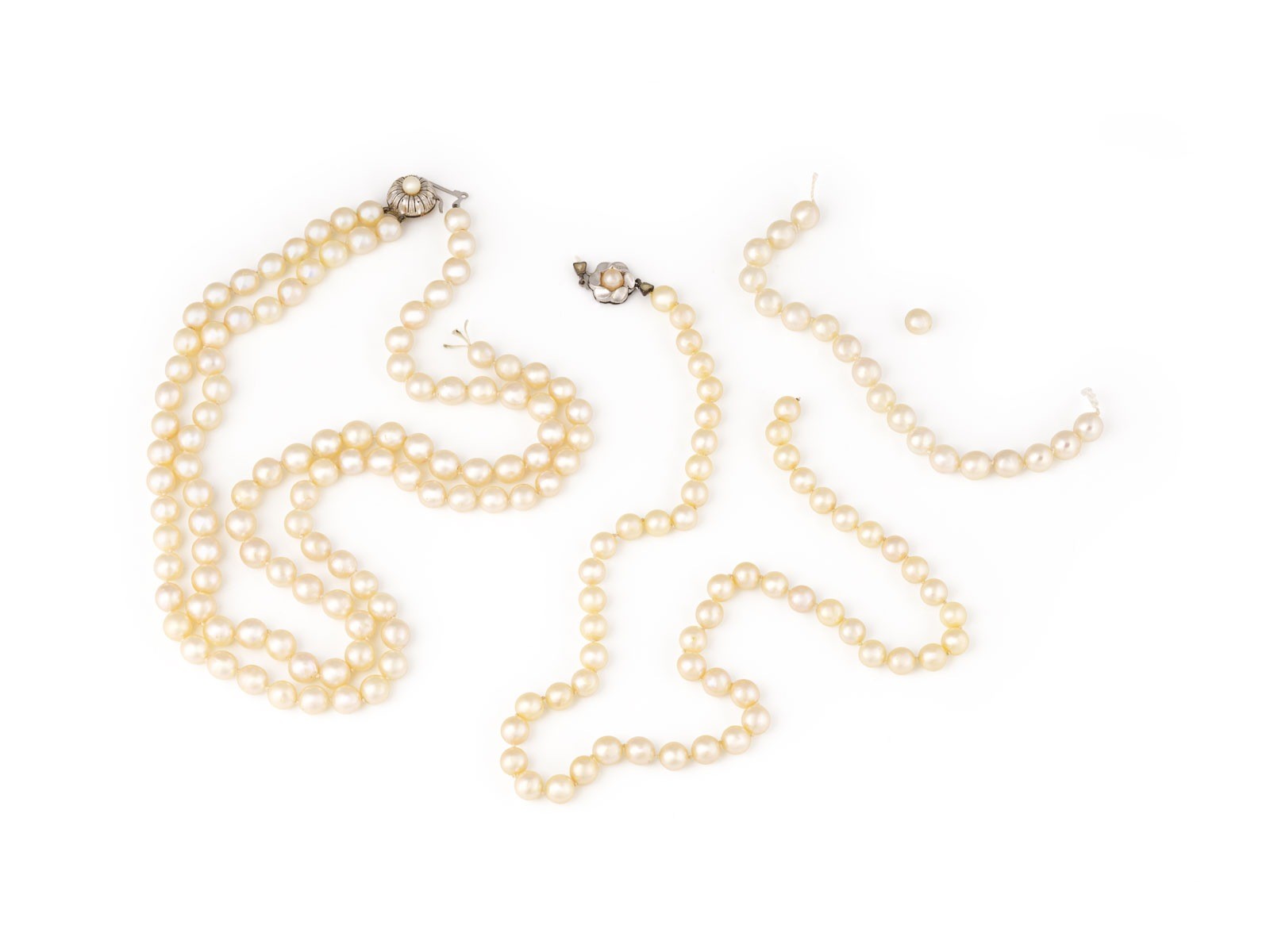 AG 835/ WG 585. Ges.-Gew.: ca. 109,1 g. Konvolut aus 2 Perlen-Colliers. Ein Doppelreihiges Collier: L.: ca. 47,0 cm, D.(Perle):