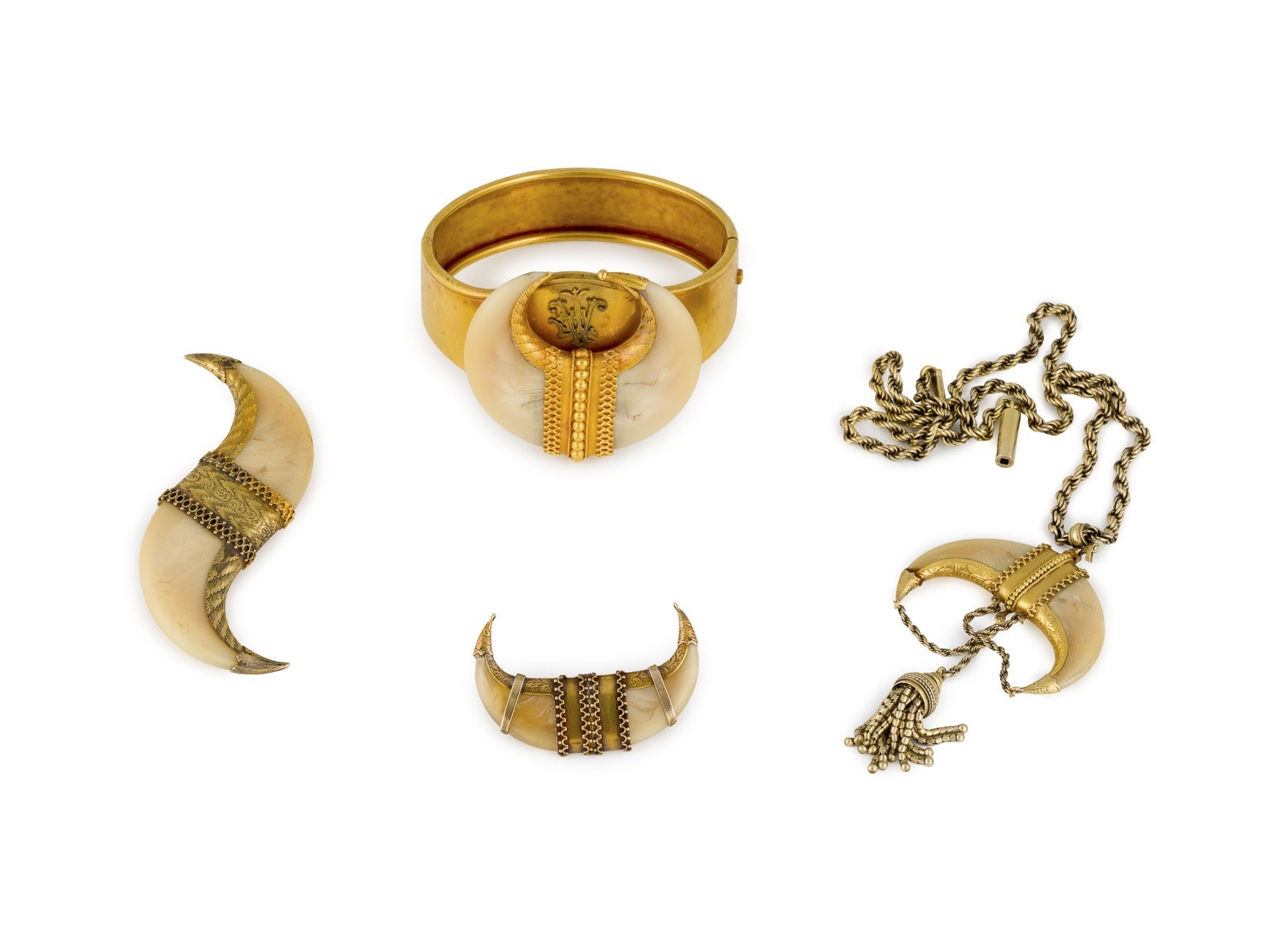 Armreif, Brosche, Kette mit Anhänger und Anhänger, Gold mit Tigerkrallen. .. Ges.-Gew.: ca. 84,8 g. 1x Großer Armreif: D.(Armreif): ca. 59,0 mm. Kopfmaß (Armreif): ca. 46,2 mm x 44,7 mm.