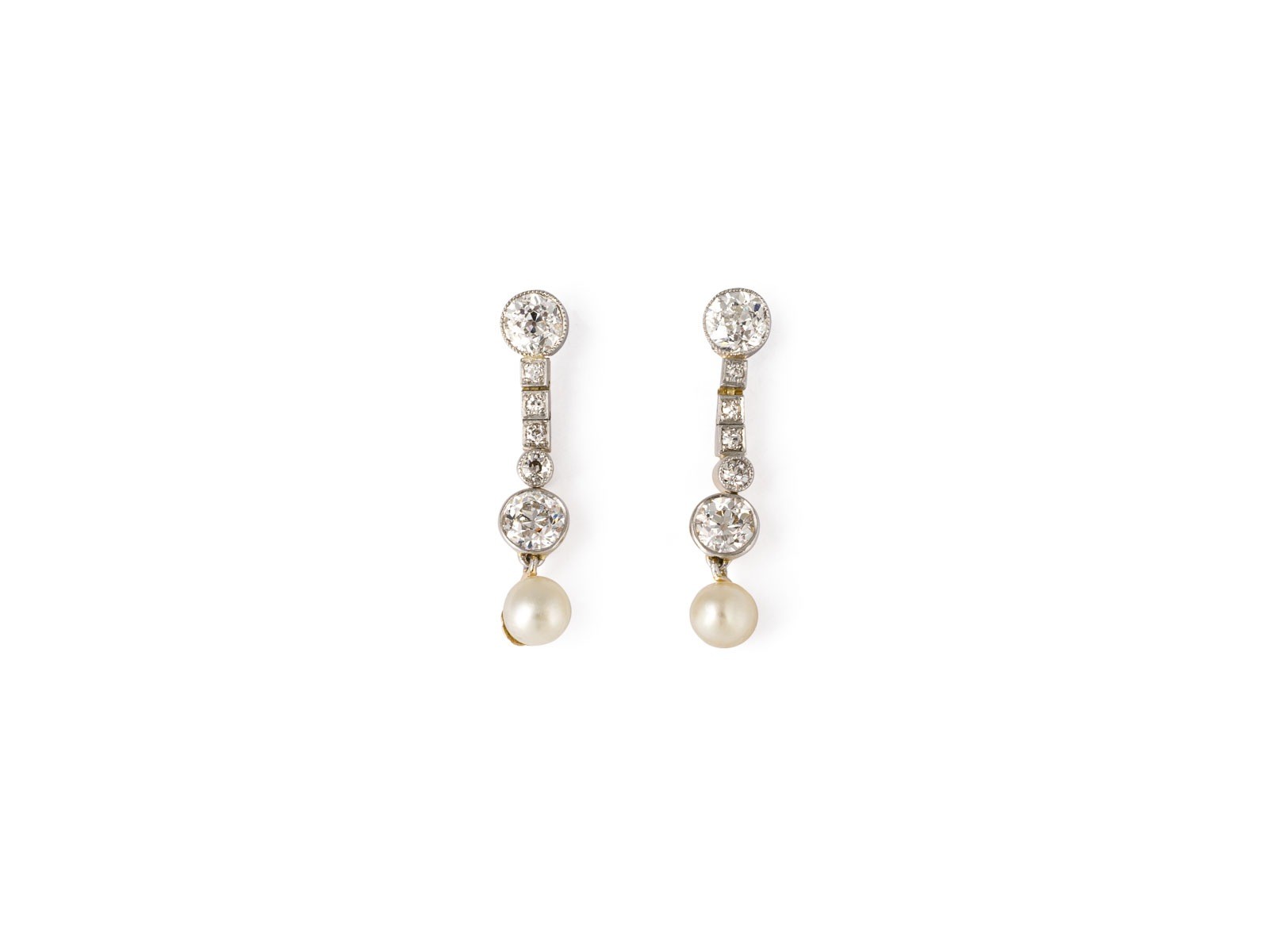 PT/GG 585 (getestet). Maße: L.: ca. 27,0 mm. Ges.-Gew.: ca. 3,4 g. Art Déco Ohrhänger, besetzt mit Diamanten im Alt- und 8/8-Schliff zus. ca. 1.50 ct.