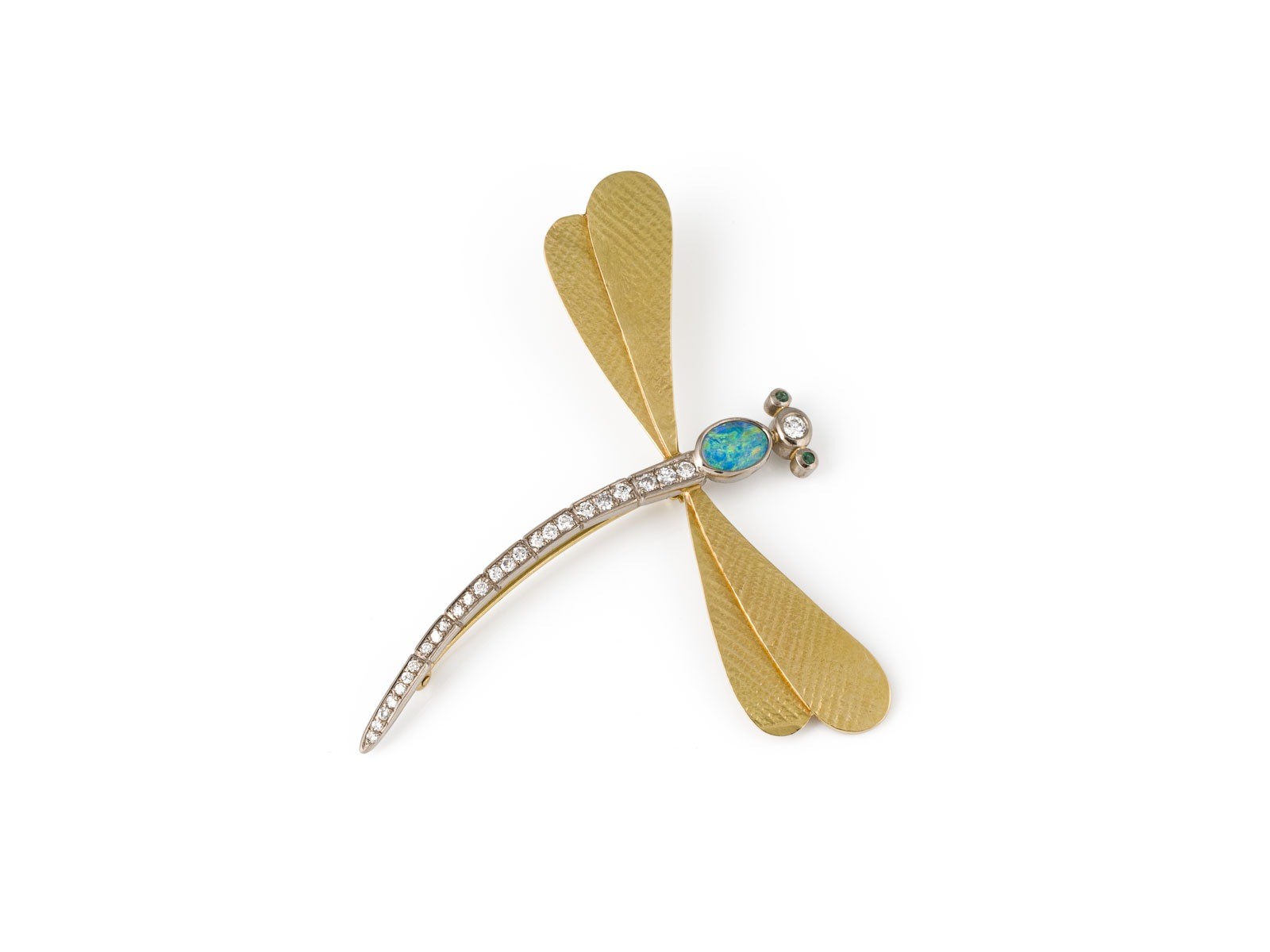 WG/GG 750. Maße: ca. 60,0 mm x 66,6 mm. Ges.-Gew.: ca. 8,5 g. Brosche in Form einer Libelle, besetzt mit 26 Brillanten zus. ca. 0.50 ct. TW/VVS, sowie