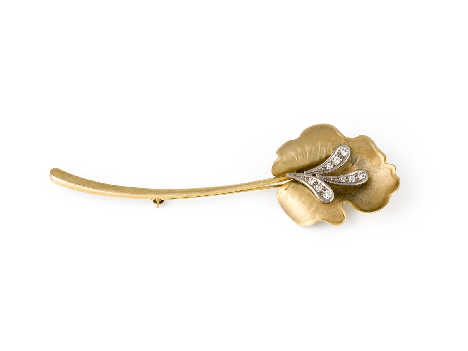 GG 333. Maße: ca. 97,6 mm x 30,0 mm. Ges.-Gew.: ca. 6,3 g. Brosche in Form eines Lotusblattes, besetzt mit Brillanten zus. ca. 0.20 ct. H-J/SI-P.
