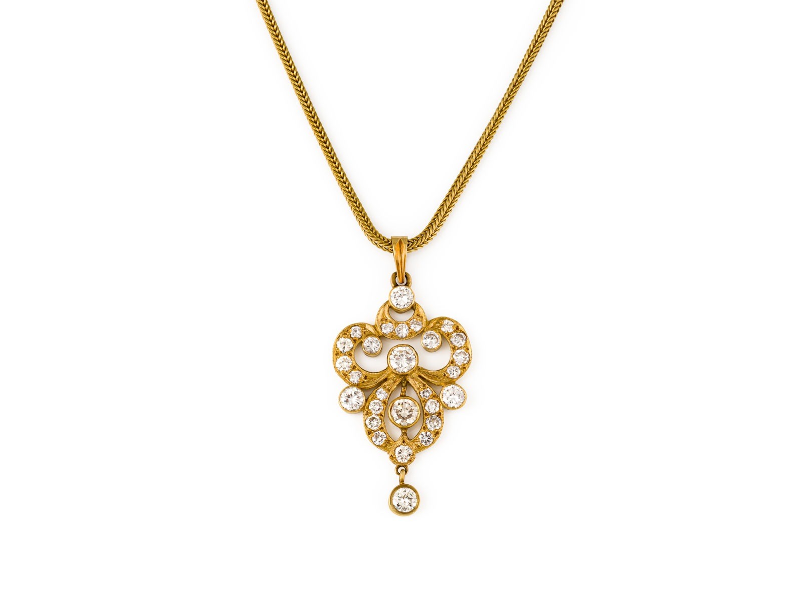 GG 750. L.(Collier): ca. 60,0 cm. Ges.-Gew.: ca. 23,6 g. Collier mit ziervollem Anhänger, üppig besetzt mit Brillanten zus. ca. 3.35 ct.