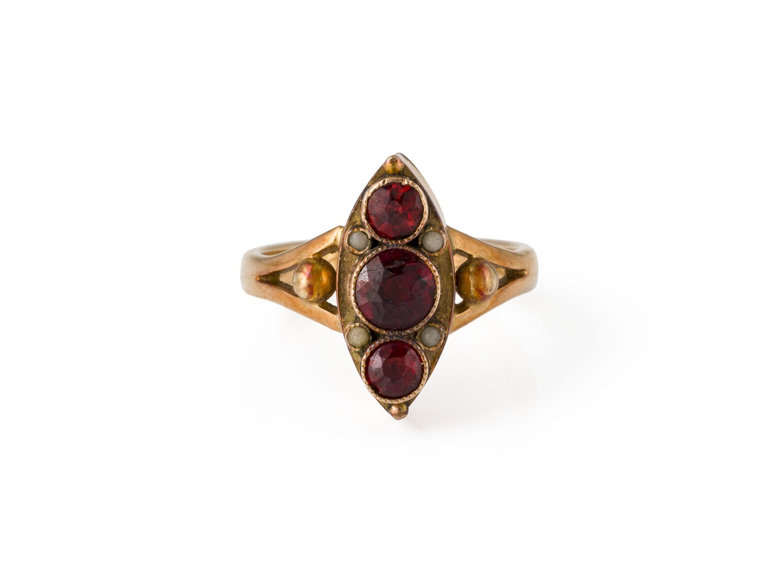 RG 585 (getestet). Ringmaß: ca. 56. Ringkopfmaße: ca. 18,0 mm x 8,2 m. Ges.-Gew.: ca. 4,7 g. Ring in Marquiseform, besetzt mit 4 kleinen Saatperlen und 3 Granaten zus. ca. 1.00 ct.