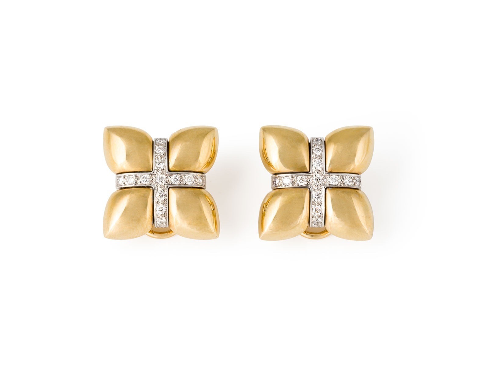 WG/GG 750. Maße: ca. 19,0 mm x 19,0 mm. Ges.-Gew.: ca. 24,9 g. Massive Ohrclips in Präsentform besetzt mit ca. 26 Brillanten zus. ca. 0.38 ct. G/VVS.