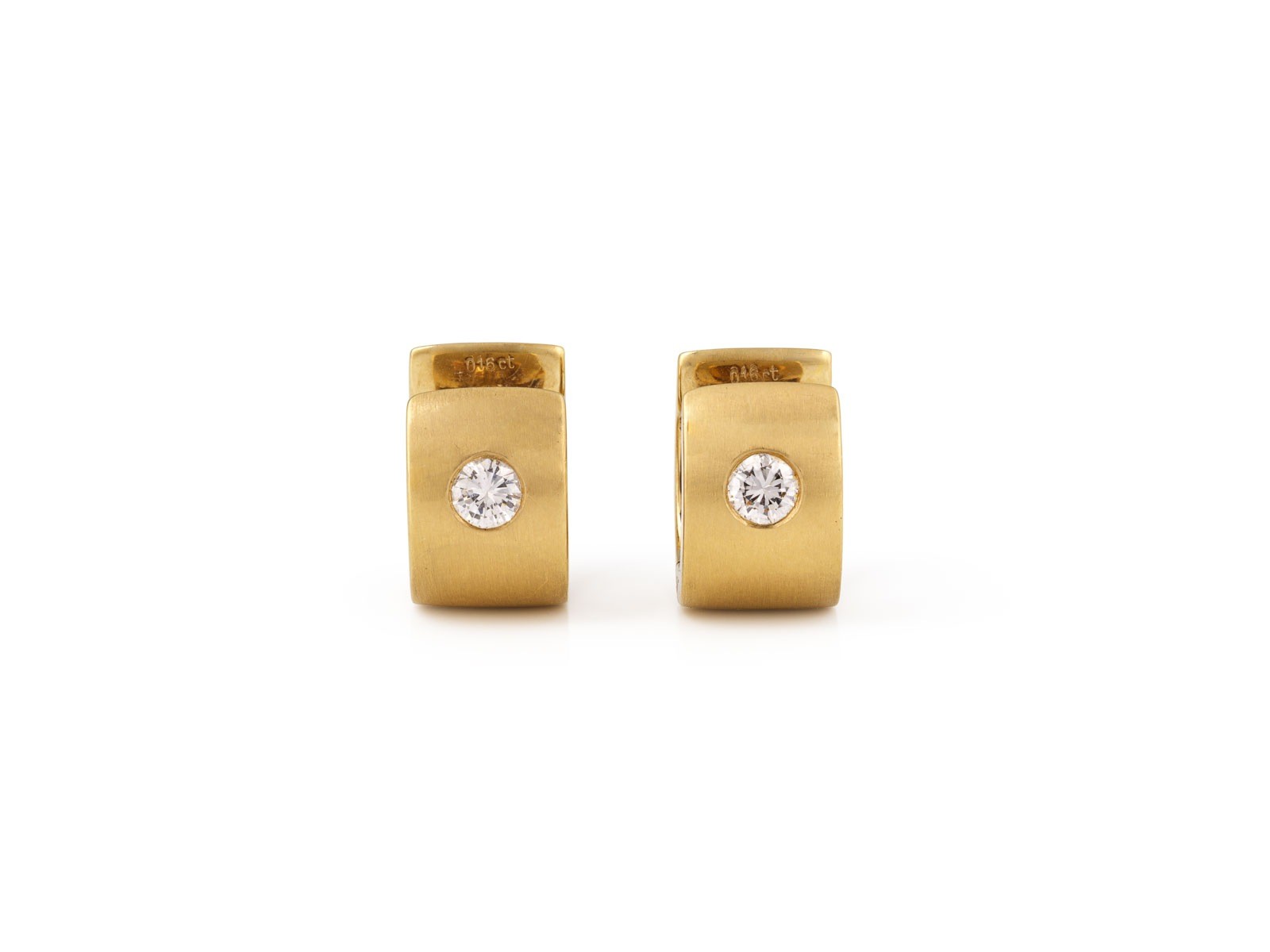 GG 750. Maße: D.(außen): ca. 13,6 mm. B.: ca. 8,1 mm. Ges.-Gew.: ca. 9,8 g. Klappcreolen, besetzt mit jeweils einem Brillanten á ca. 0.15 ct. H/VS.