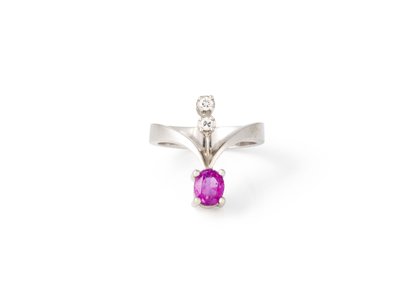 WG 585. Ringmaß: ca. 50. Ringkopfmaße: ca. 17,8 mm x 5,4 m. Ges.-Gew.: ca. 4,8 g. Ring mit 2 farblosen Steinen und einem oval facettierten, rosa Farbstein.