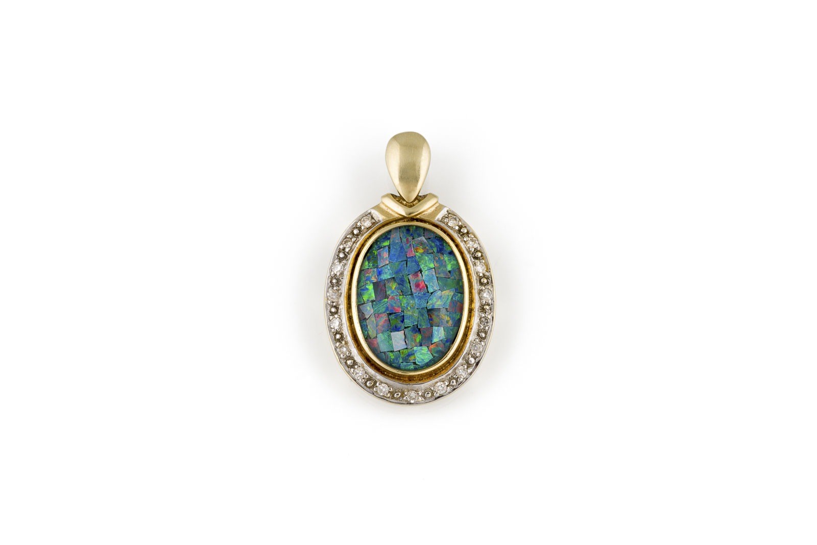 GG 585. Maße: ca. 33,7 x 21,0 mm. Ges.-Gew.: ca. 7,4 g. Anhänger, besetzt mit einer Mosaik-Opal-Triplette und einem Kranz aus Diamanten im