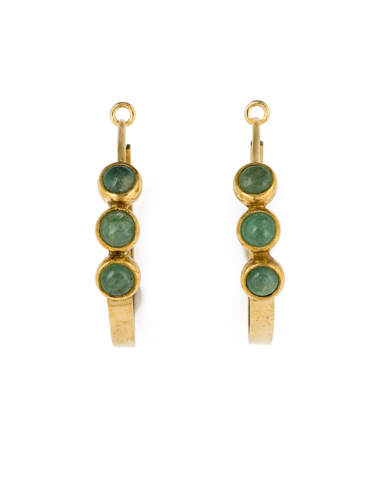 GG 750 (getestet). Maße: ca. 29,5 x 26,0 mm. Ges.-Gew.: ca. 6,6 g. Creolen, besetzt mit Smaragd-Cabochons zus. ca. 0.60 ct.
