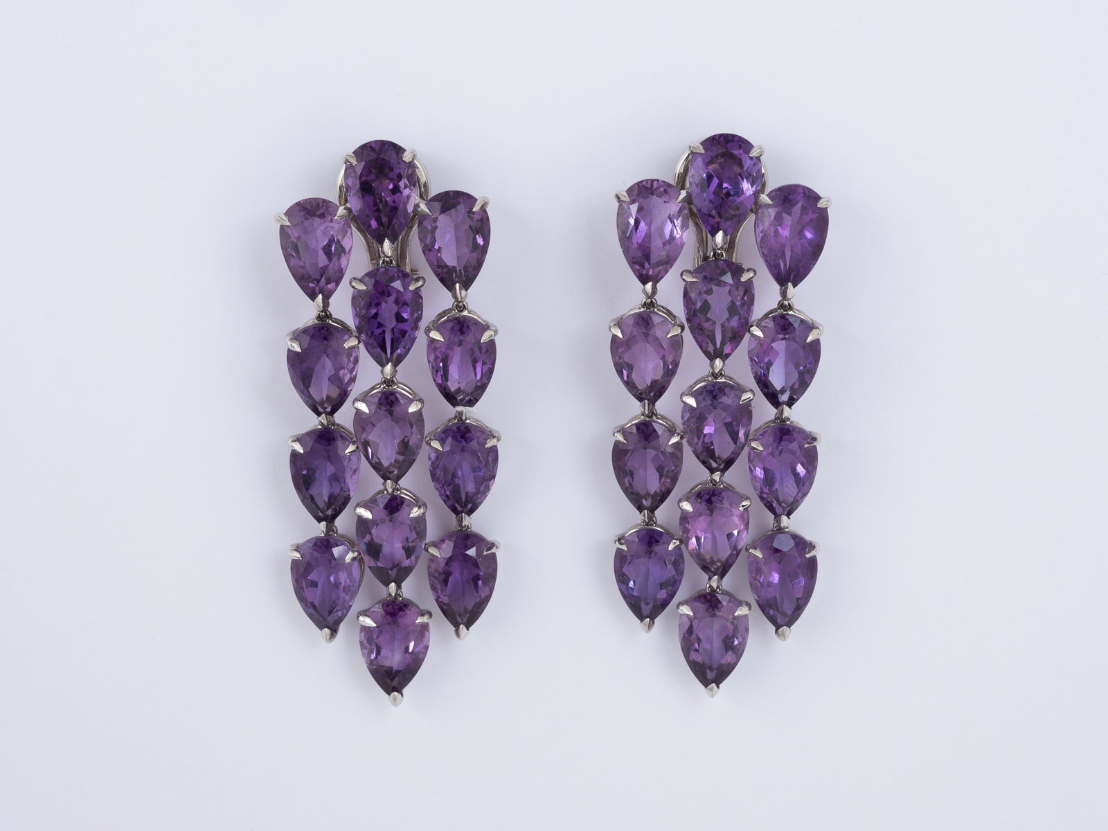 Weißgold. L. 6,4 cm, Ges.-Gew. ca. 41,4 g. Gest. 750, Herstellersignet 'Hornemann'. Jeweils dreireihig herabhängende, tropfenförmig facettierte Amethyste, insgesamt 26,